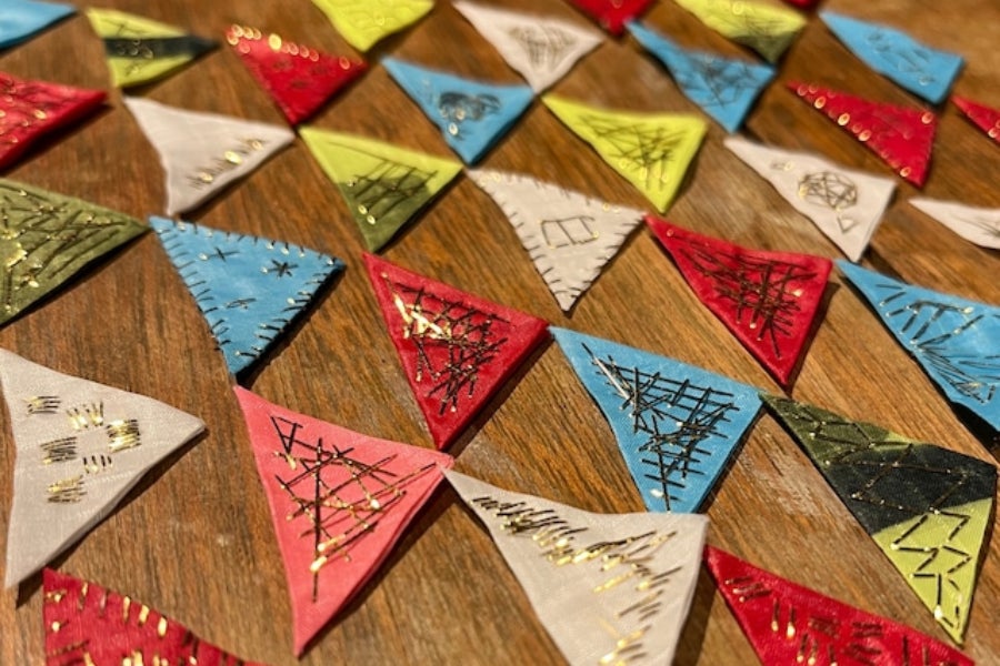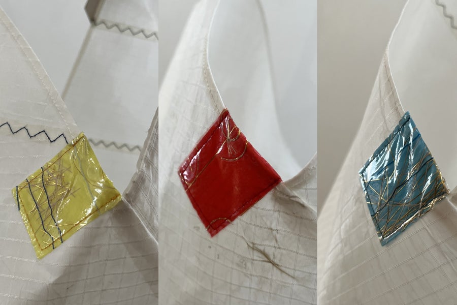 役目を終えたヨットの帆に福祉施設のクリエイターさんが金糸刺繍を施した「金継ぎタグ」