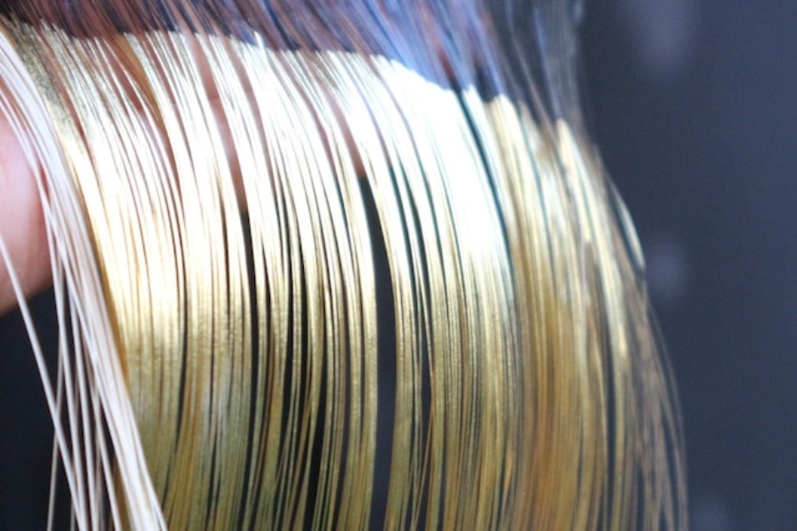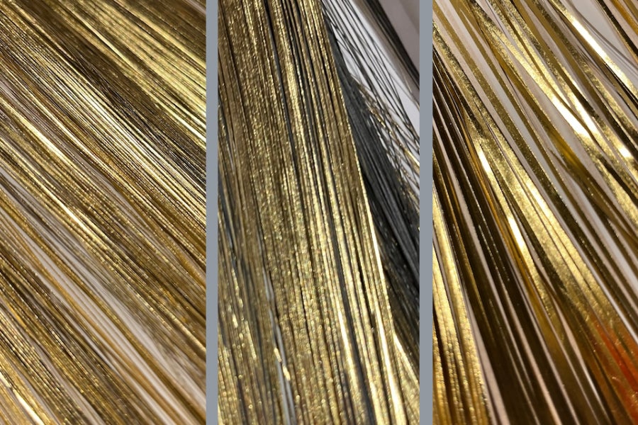 ウルシという木の樹液である漆を糊に金箔を押した和紙を裁断して作られる金糸。