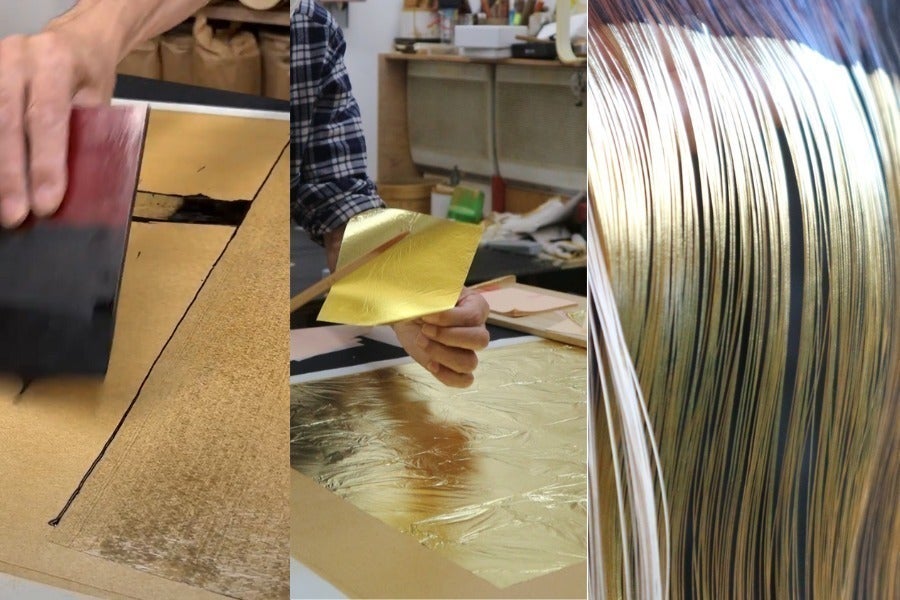 2年半前、漆を塗って金箔を貼った和紙を裁断して作られる