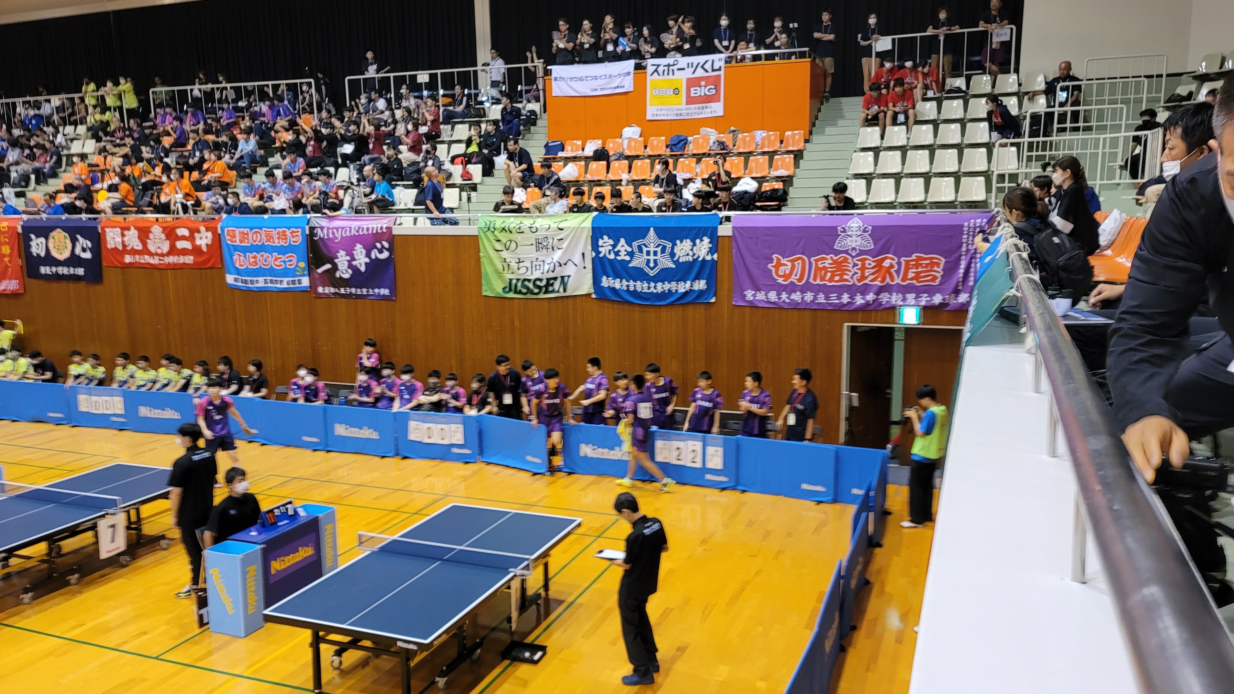 中村史門さん、1セット目、4点差つけられていましたが、最後ジュースに持ち込み、逆転でとったのが、すごかったです! その後もずっと接戦でしたが、競り勝ちました! スタンドから応援していた同じ学年の柏木康佑さんのものすごい大きな声での応援、すごかったです。涙が出てくるようでした。応援部隊で全員連れてこれて本当に良かったと心から思いました。支援者のみなさん、ありがとうございました!