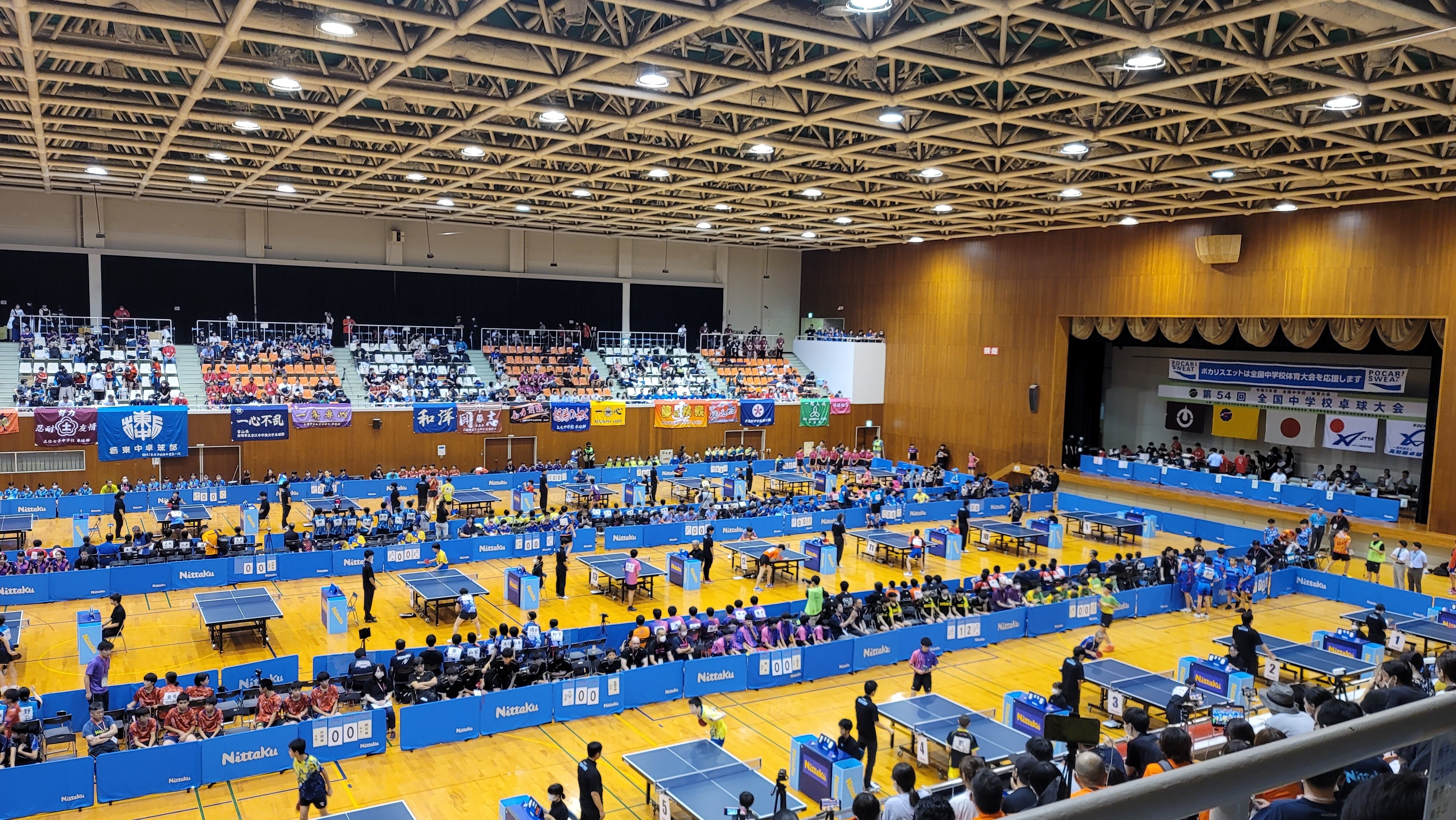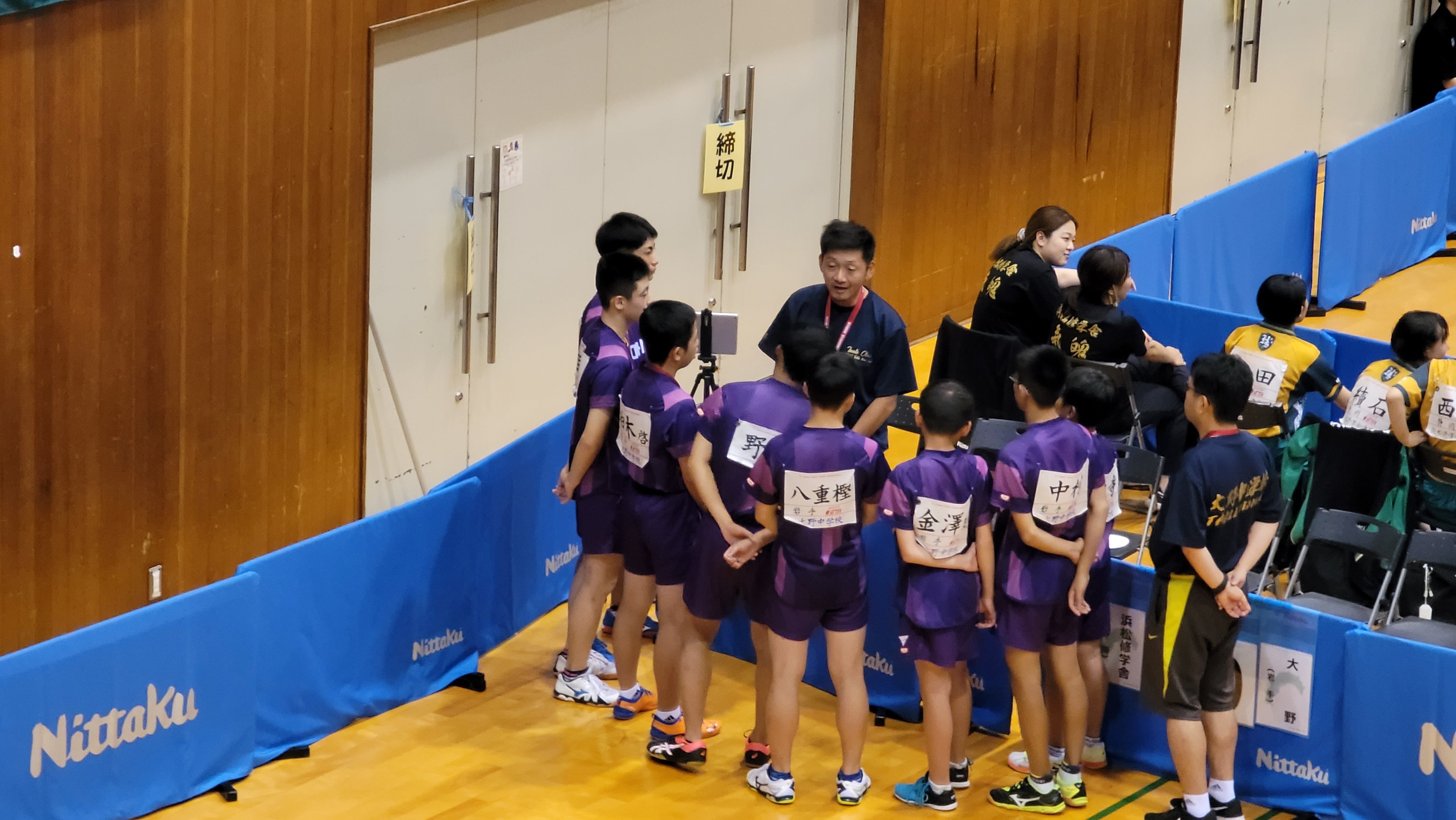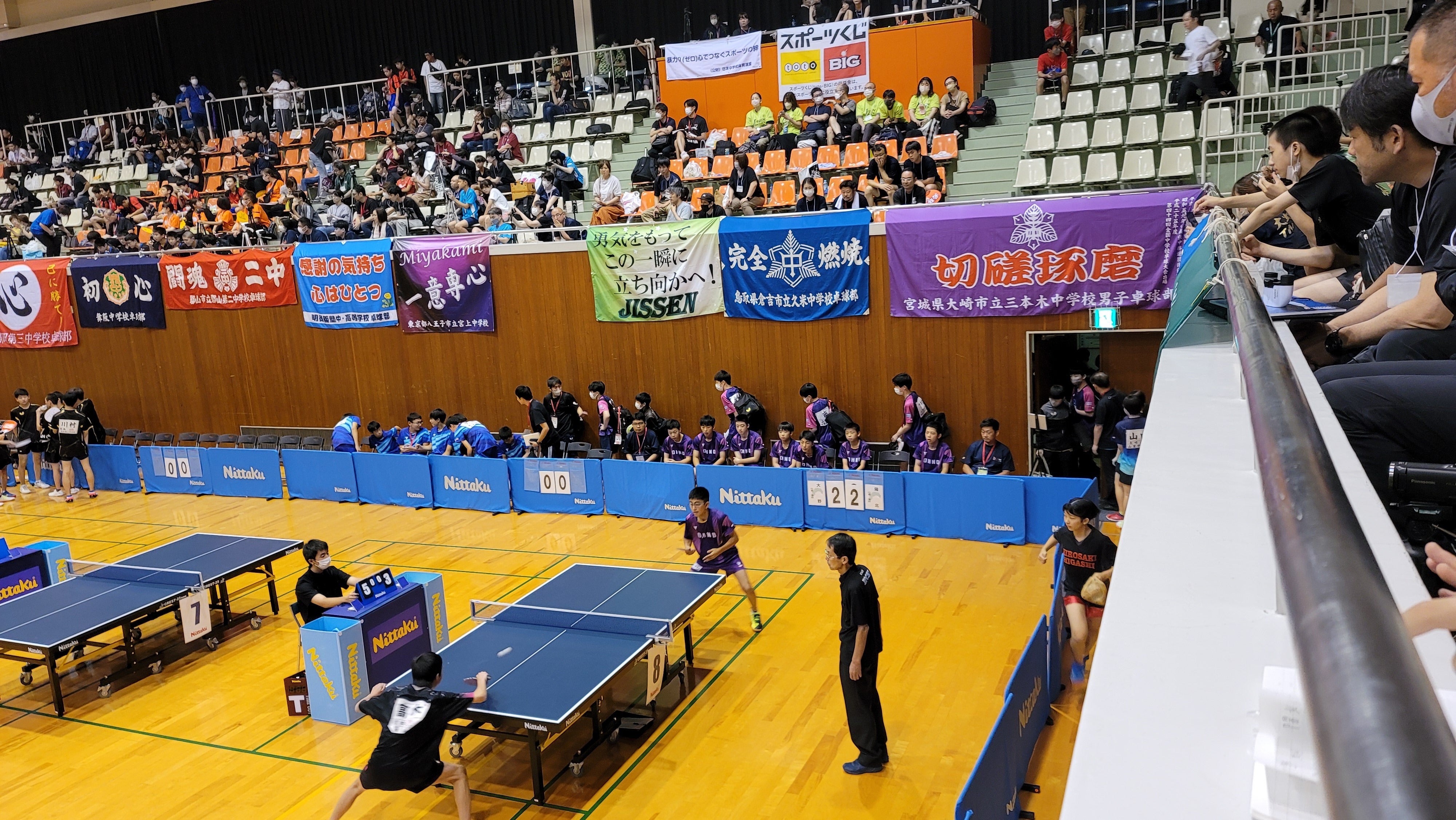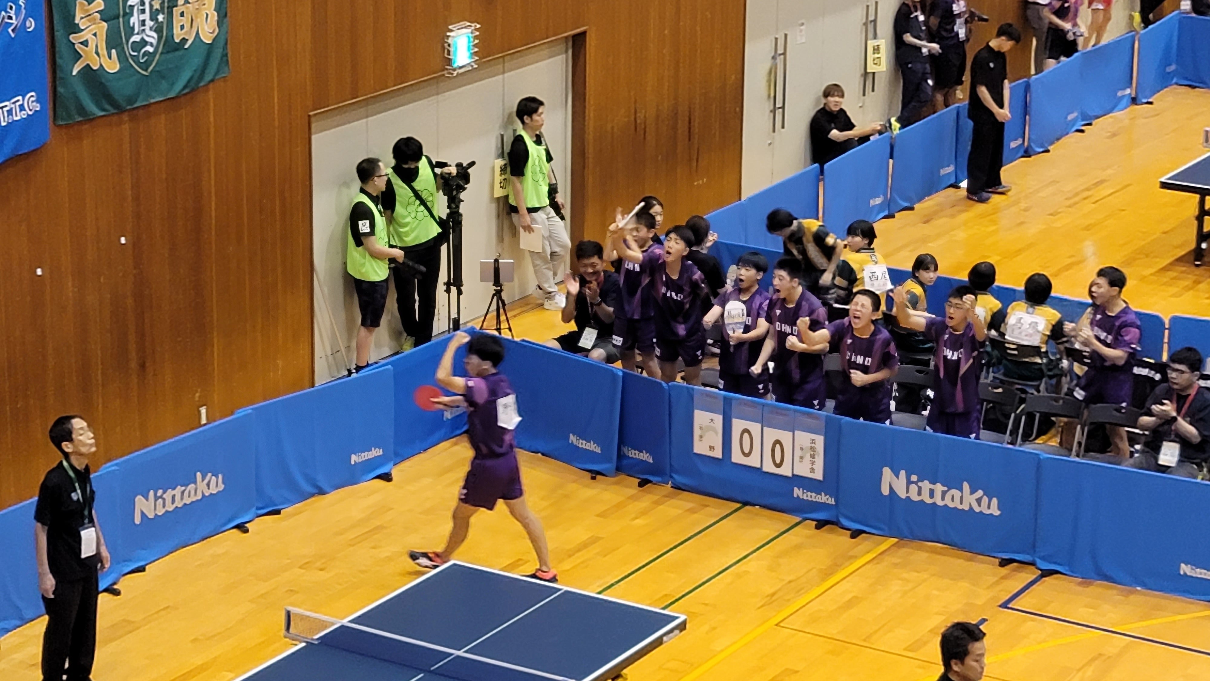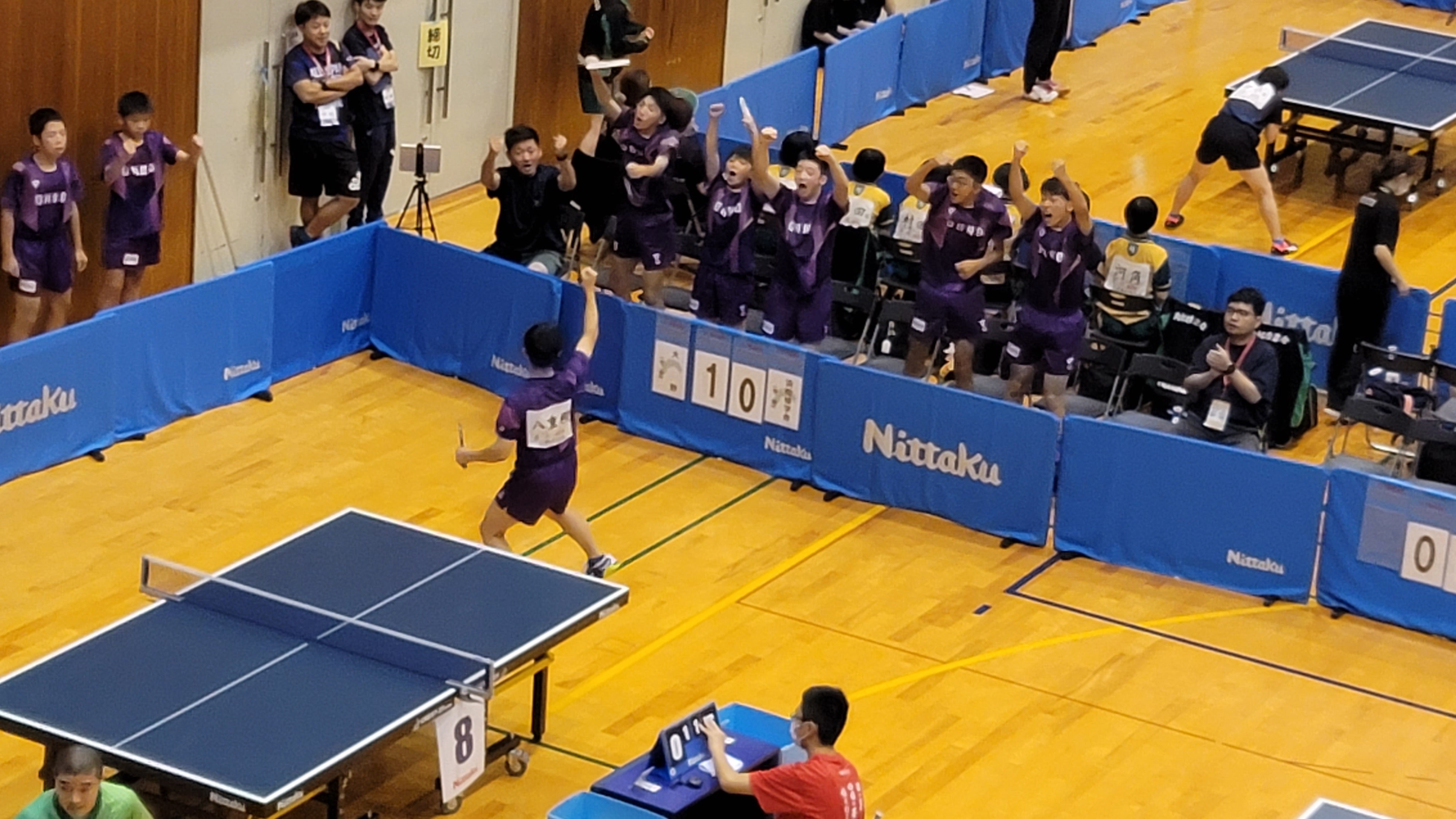 五番手 中村史門さん15-137-1111-911-73-1で勝利! 3-2で初戦、勝利です! 中村史門さん、1セット目、4点差つけられていましたが、最後ジュースに持ち込み、逆転でとったのが、すごかったです! その後もずっと接戦でしたが、競り勝ちました! スタンドから応援していた同じ学年の柏木康佑さんのものすごい大きな声での応援、すごかったです。涙が出てくるようでした。応援部隊で全員連れてこれて本当に良かったと心から思いました。支援者のみなさん、ありがとうございました! 全国で勝つことは簡単なことではありません。ですが、全員の力で勝ちとった全国1勝です! とても嬉しいです! 苦しい試合だったのでなおさらそう思います! 感動しました! 岩手から応援してくださったみなさん、本当にありがとうございました! 大野中卓球部の子どもたち、頑張りました!!