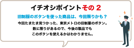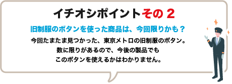 いくつかの商品アイディアを出して実際にサンプルを製作していく中で、「もう少しメトロ感を出すにはどうしたらいいか」と考えていたところ、別部署のメンバーから廃棄される制服も活用できるのではとのアドバイスがあり、制服の袖章とボタンも活用することに!!