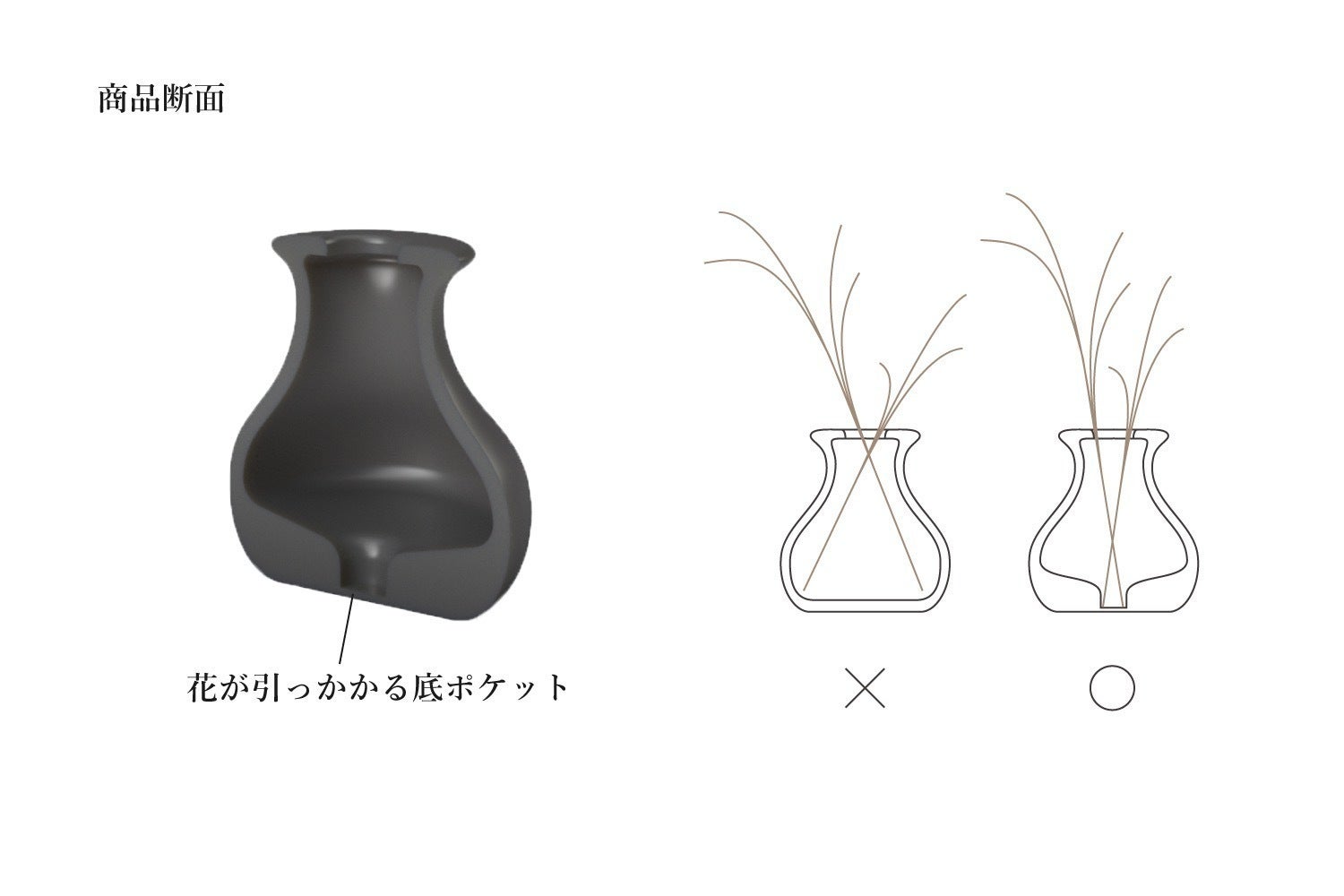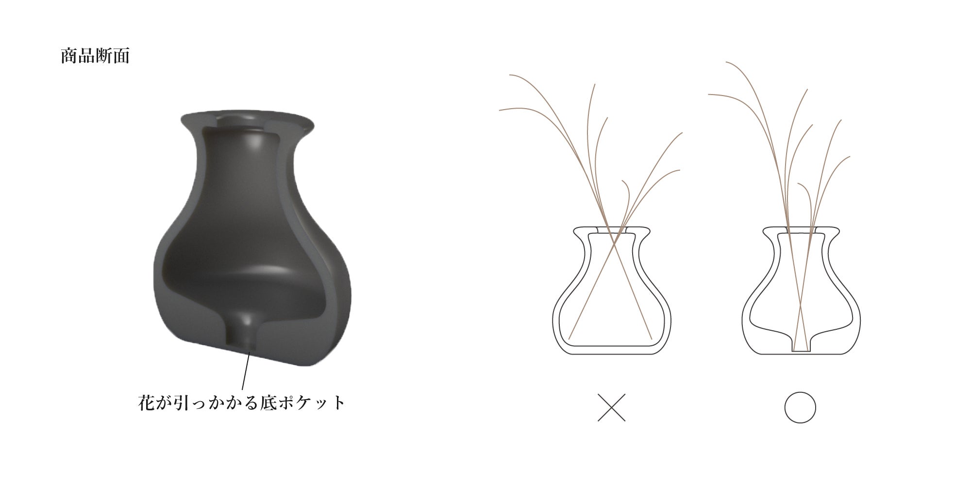 サイズ感や質感だけでなく、飾る花の佇まいにも拘っております。底面には凹みがついており、そこに花が引っ掛かることでまっすぐに立つ仕組みになっております。横にグデっと倒れる事はなく、すらっと美しく飾る事ができます。既存の花瓶の製法では、このように内側に特殊な形状を施す事は中々難しいため、3Dプリンターならではの工夫点と言えます。