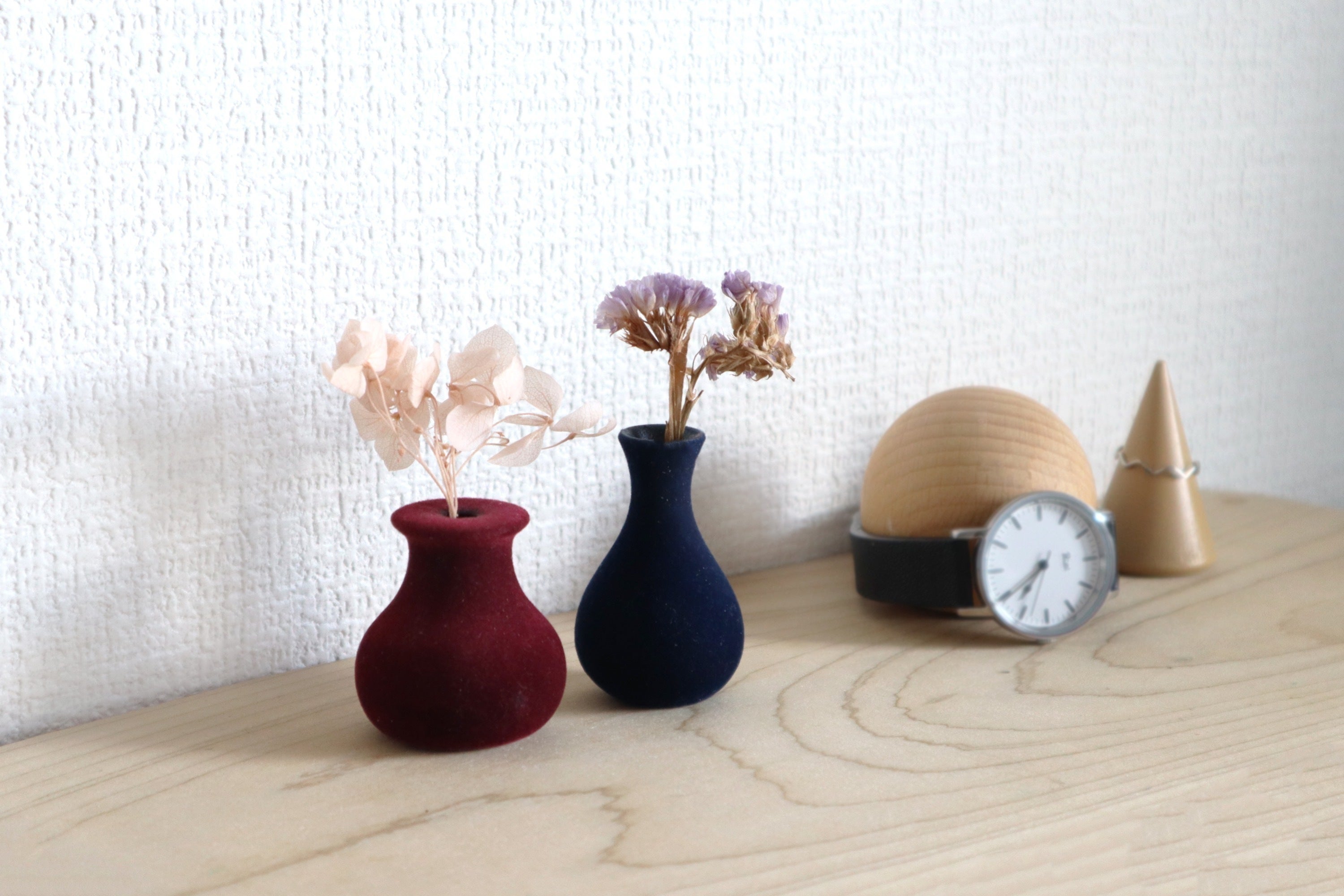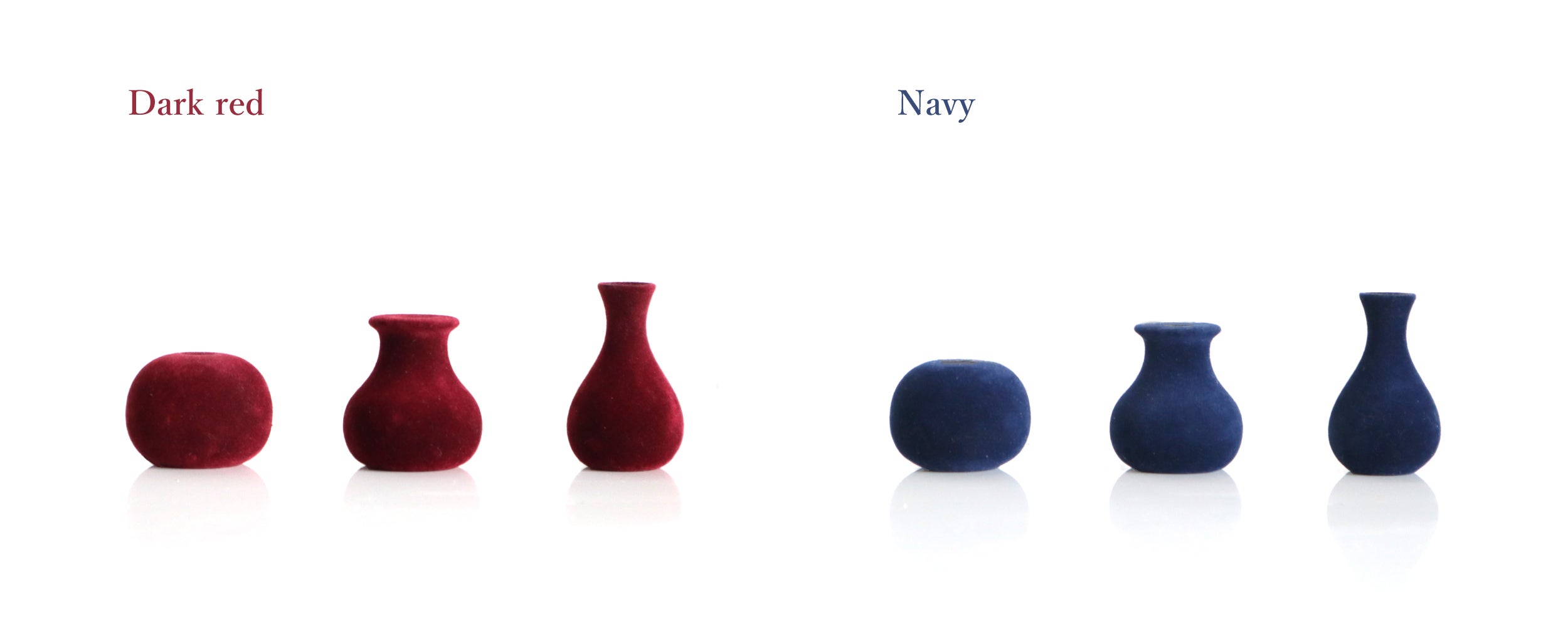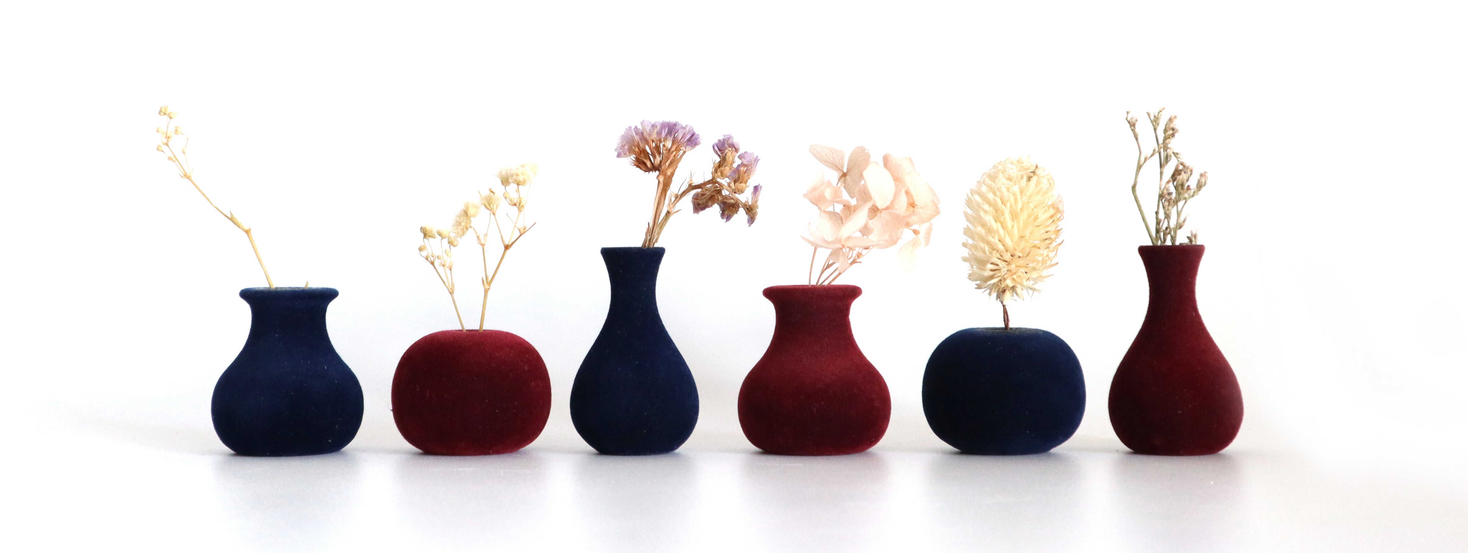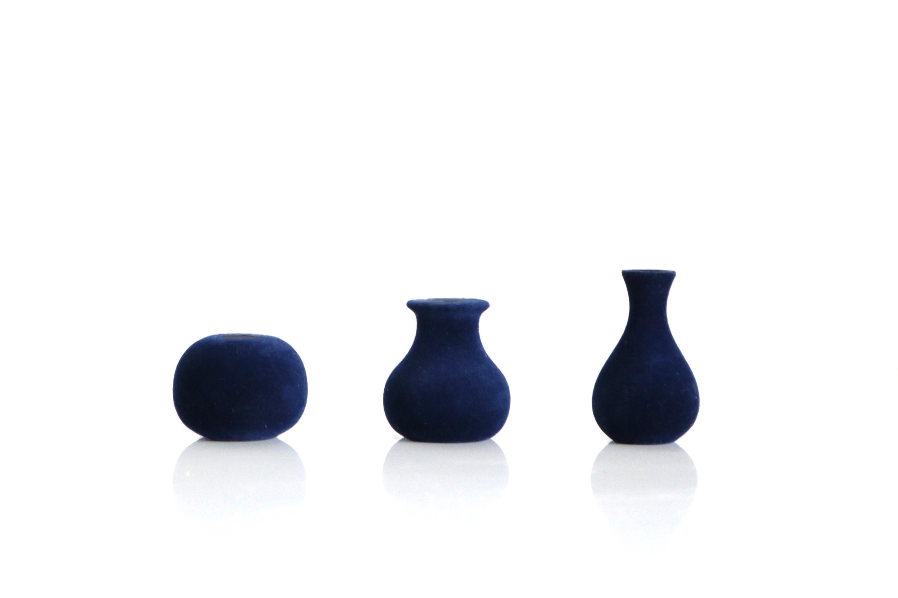 狭い所も飾れる手の平サイズの小さな花瓶3個セットです。細かい毛が生えており思わず握ってしまう触り心地に仕上げました。内側の底面には凹みが付いており花がまっすぐ美しく立つようになっています。エンジとネイビーの2色展開です。
