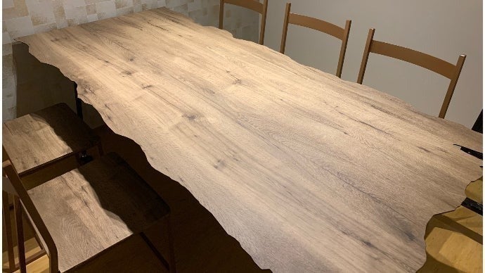 そこで、木目調に仕上げるために、鉄製の天板を 木の優しさが伝わるようにカットし、木目調のシートで手作 業で丁寧に仕上げております。