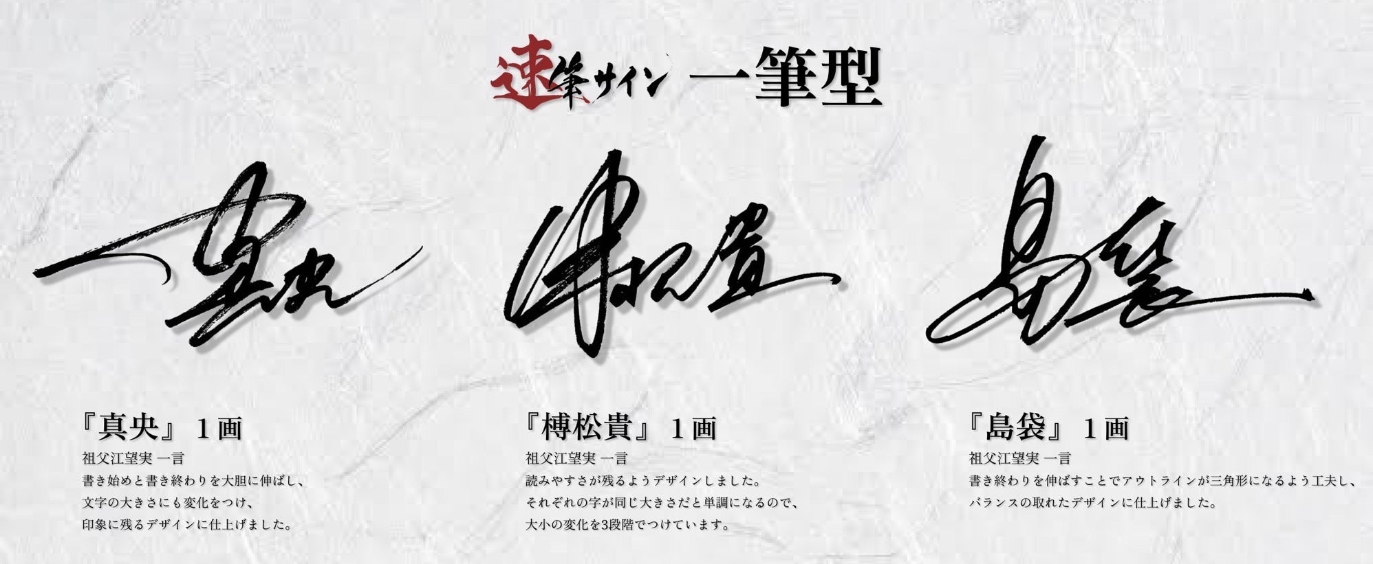 書道家として培った技術と速筆サインを創り続けてきた経験から、文字本来の美しさを損なわずにそれぞれの文字の魅力を引き出し、一筆に仕上げる全く新しいサインが完成しました。