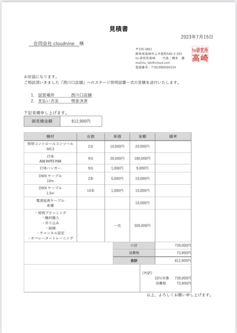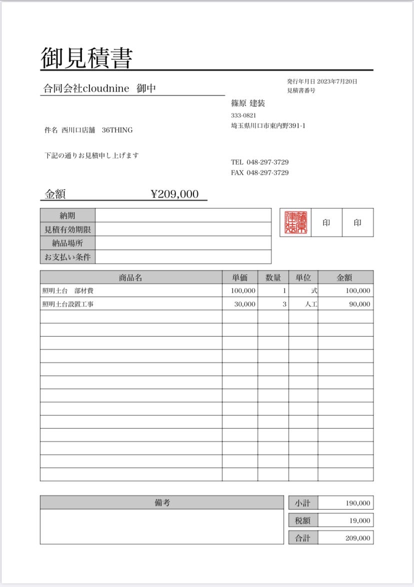 ※見積もり依頼後、未確定のものもまだございますため、こちらには暫定的な見積書を掲載させて頂きます。