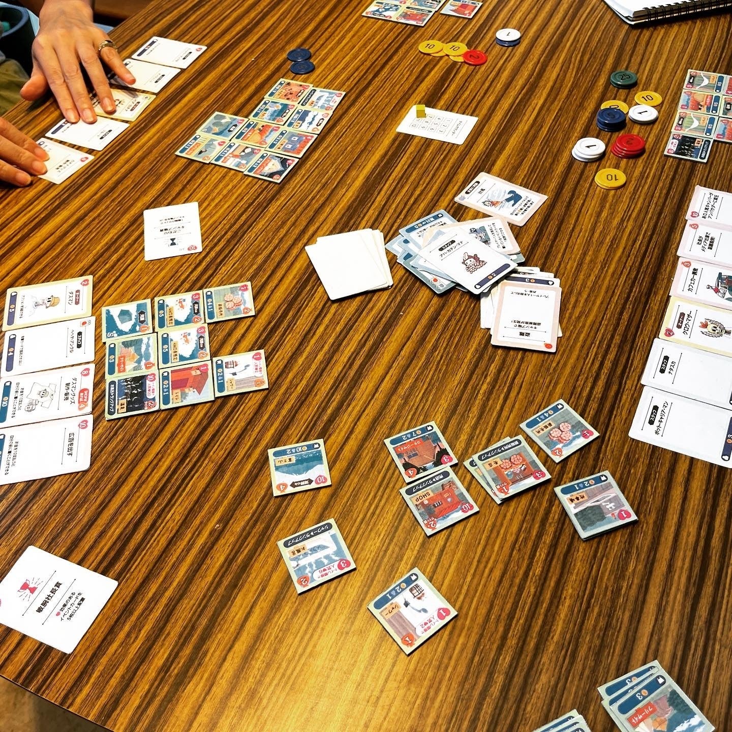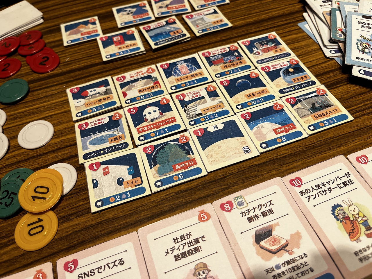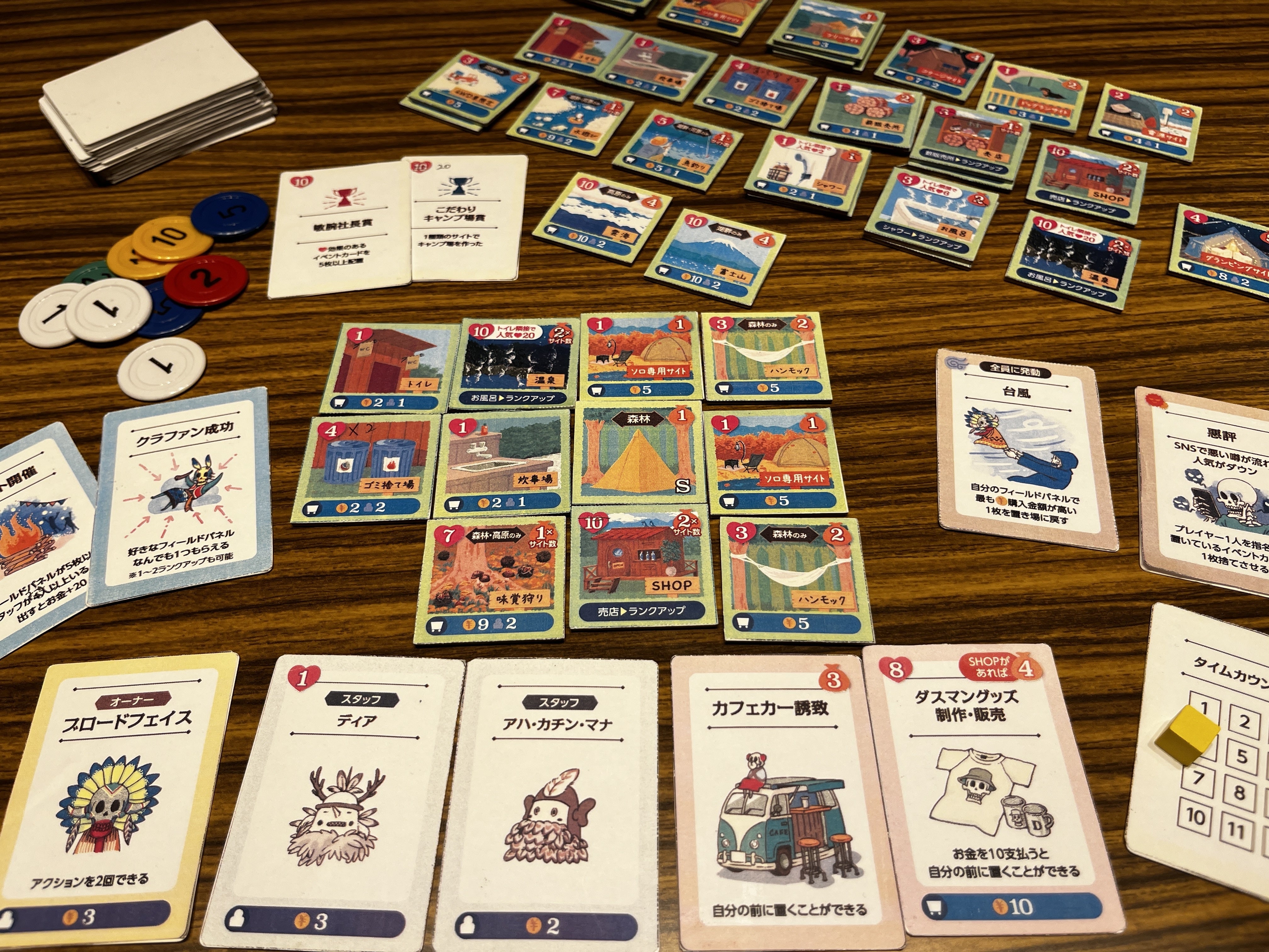 その一方、森林サイトや高原サイト、湖畔サイト、河原サイト、など、初期設定が異なる「施設カード」により設営できる施設が若干変わり、戦略の変更を強いられたり、社長カードによって、できるアクションが変わったり遊ぶ度に違った楽しみを体験できます。