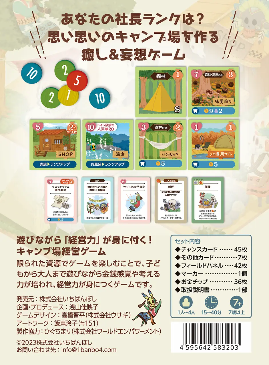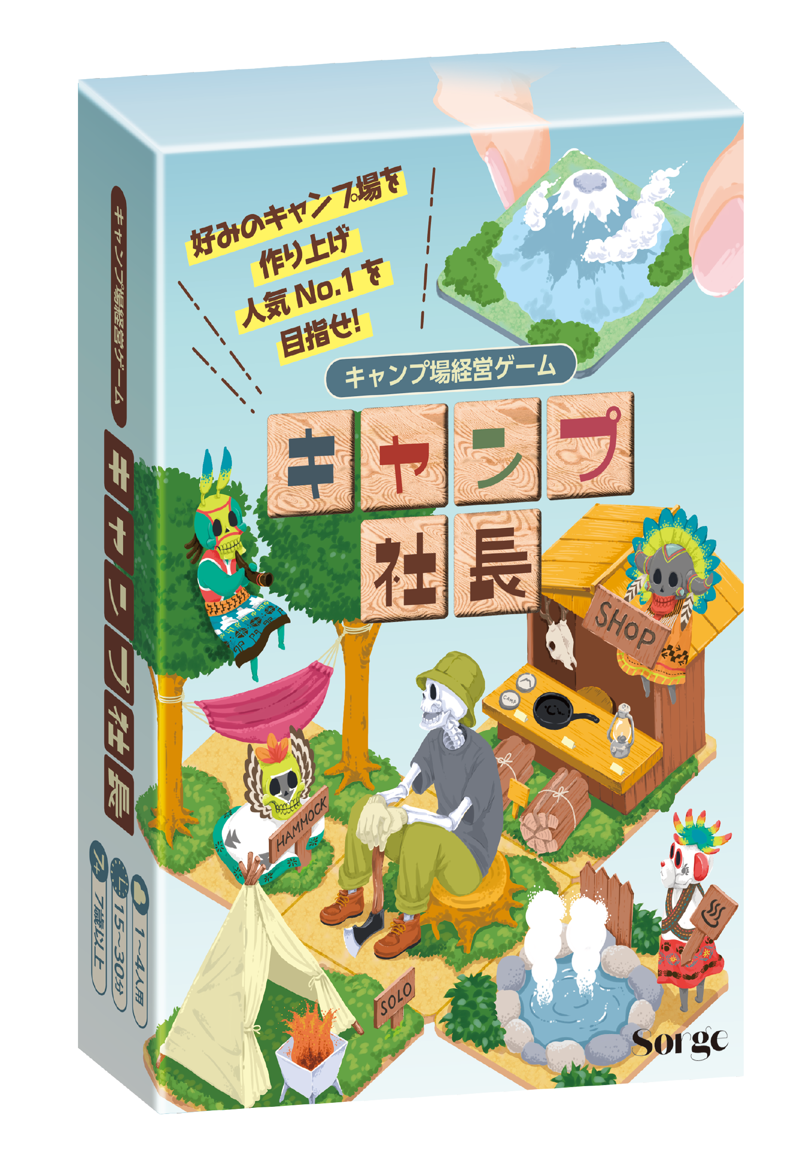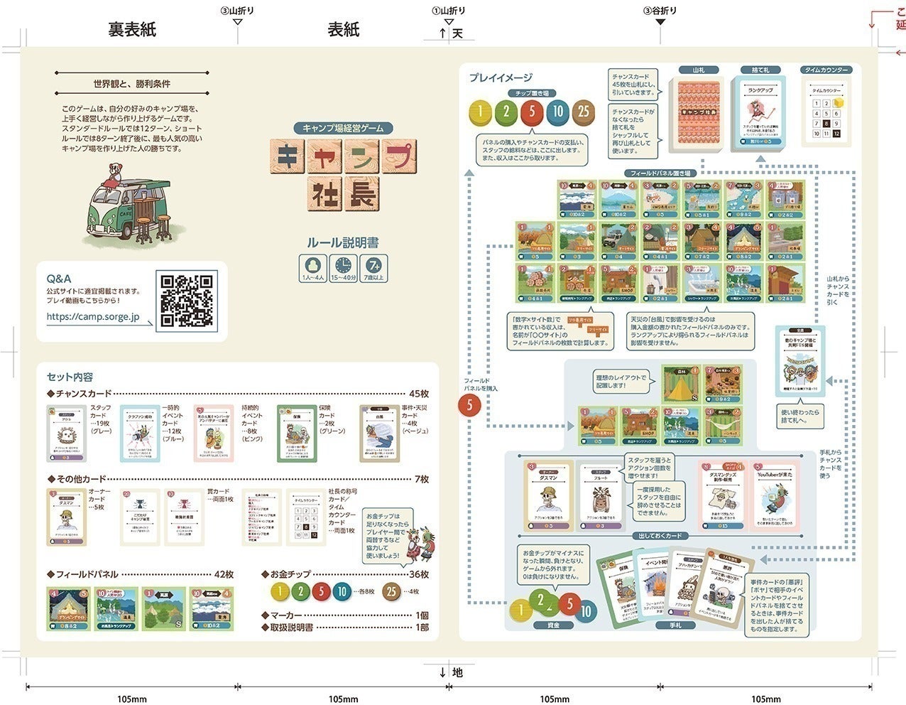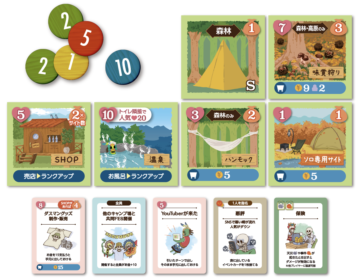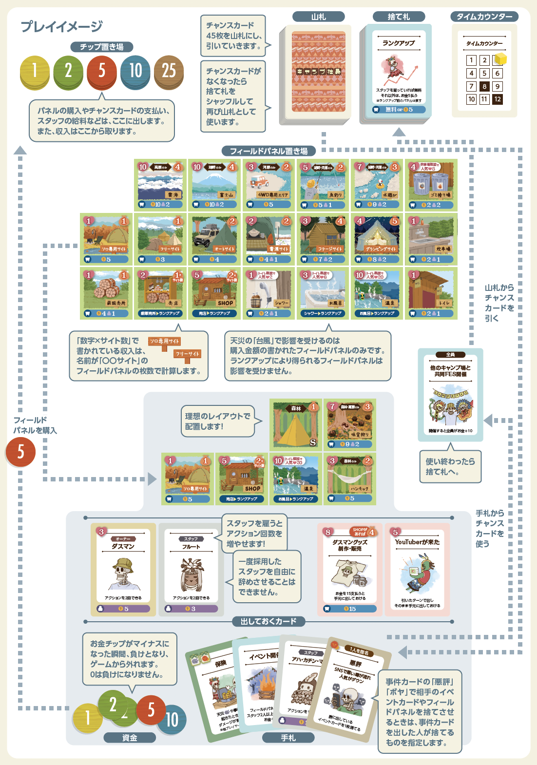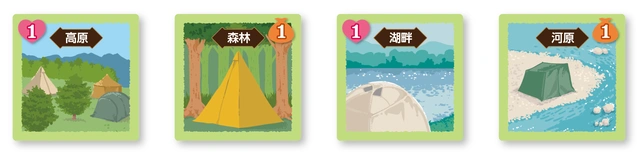 このボードゲームでは、あなたは、キャンプ場の経営者となり、人気No.1のキャンプ場を目指して他プレイヤーと競い合います。