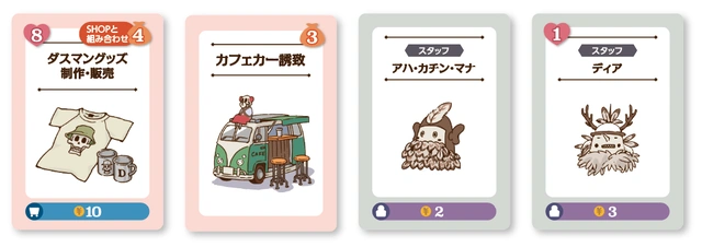 このゲームでは、施設を表す「施設パネル」、社長や従業員を表す「スタッフカード」、各種イベントが開催される「イベントカード」など、様々なカードを使って遊びます。