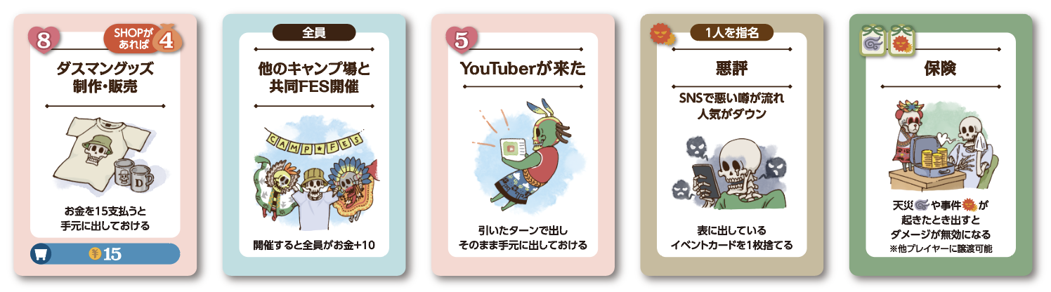 イベントカードの中には、「攻撃」カードで人気がダウンしたり、「天災」カードにより、建設した施設が、壊れてしまい、リスクヘッジを怠ったために、キャンプ場を売却せざるを得なくなってしまったり....。