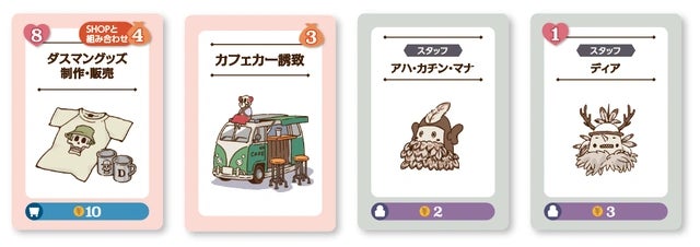 このゲームでは、施設を表す「施設パネル」、社長や従業員を表す「スタッフカード」、各種イベントが開催される「イベントカード」など、様々なカードを使って遊びます。