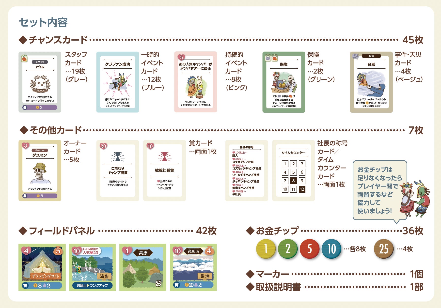 このボードゲームでは、あなたは、キャンプ場の経営者となり、人気No.1のキャンプ場を目指して他プレイヤーと競い合います。