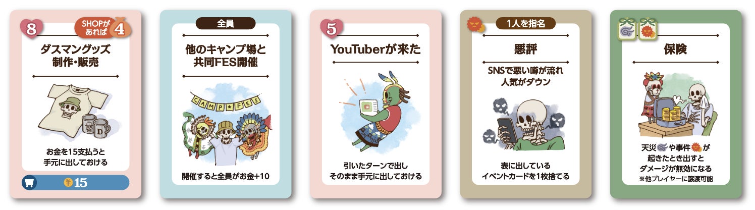 イベントカードの中には、「攻撃」カードで人気がダウンしたり、「天災」カードにより、建設した施設が、壊れてしまい、リスクヘッジを怠ったために、キャンプ場を売却せざるを得なくなってしまったり....。