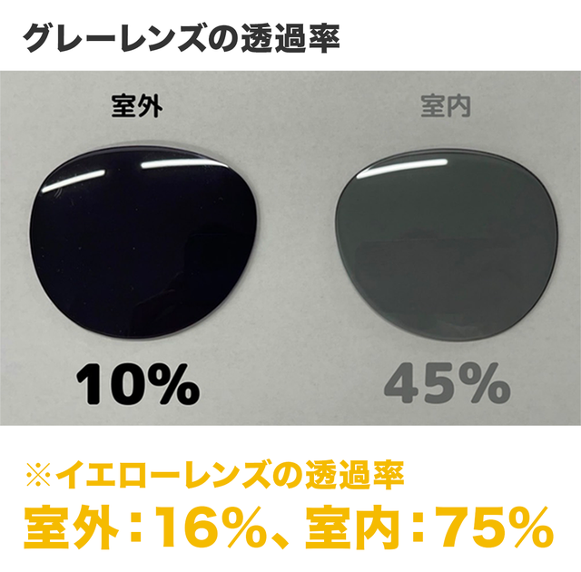 調光レンズとは、レンズの色調を自動的に調整することができる機能です。屋内や暗い場所ではクリアなレンズ(室内45%、室外10%)であり、屋外や日差しの強い場所では暗くなり、眩しさを抑えることができます。