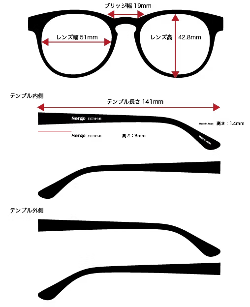 ・レンズ横幅:(片側最長)51mm・レンズ縦幅:(最長)42.8mm・テンプル幅:141mm