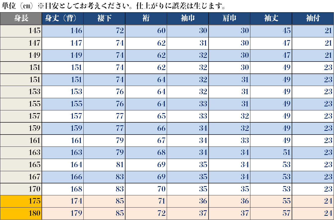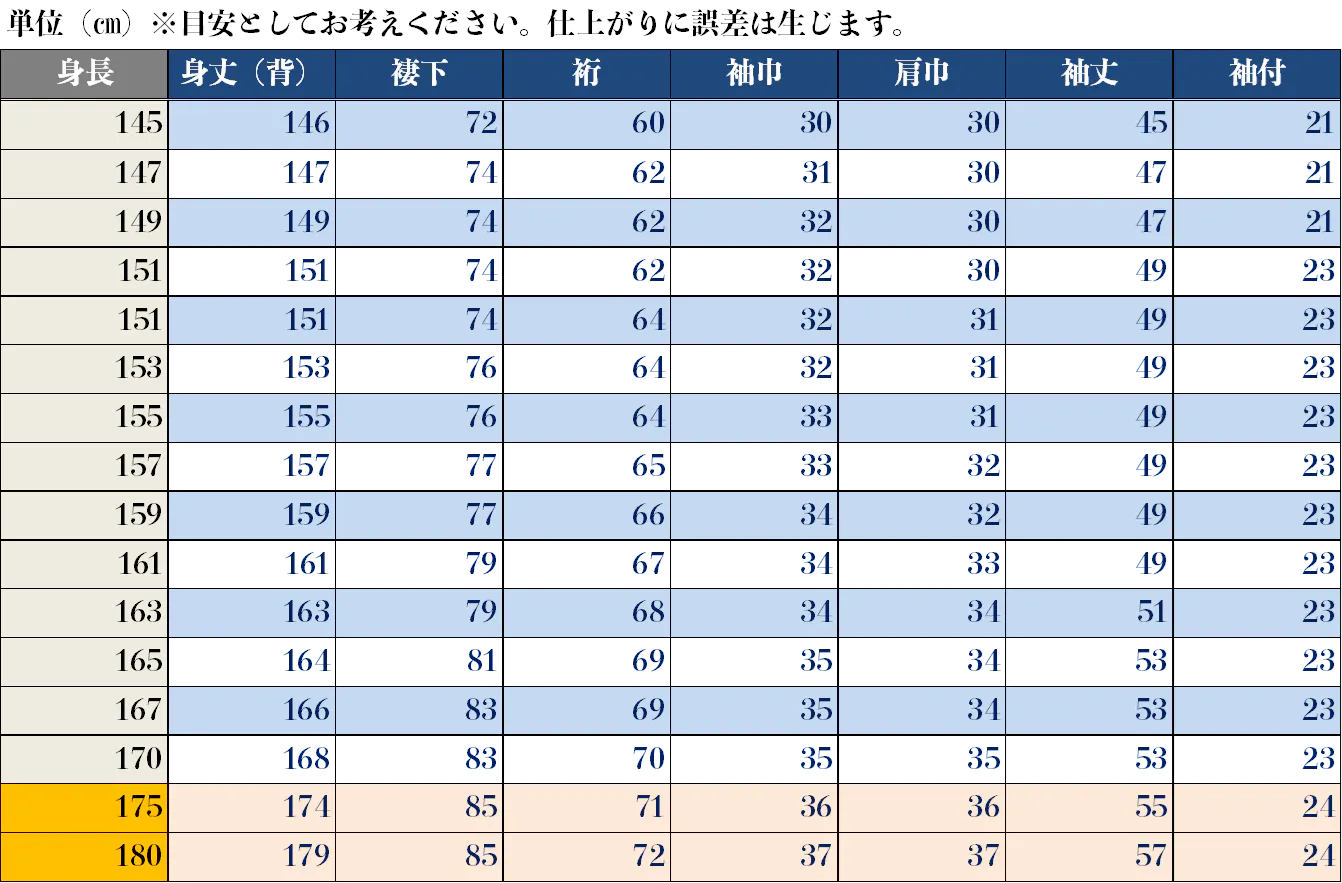 仕立てサイズには基準を設けておりますが、お一人お一人にあったサイズにてお届けいたします。