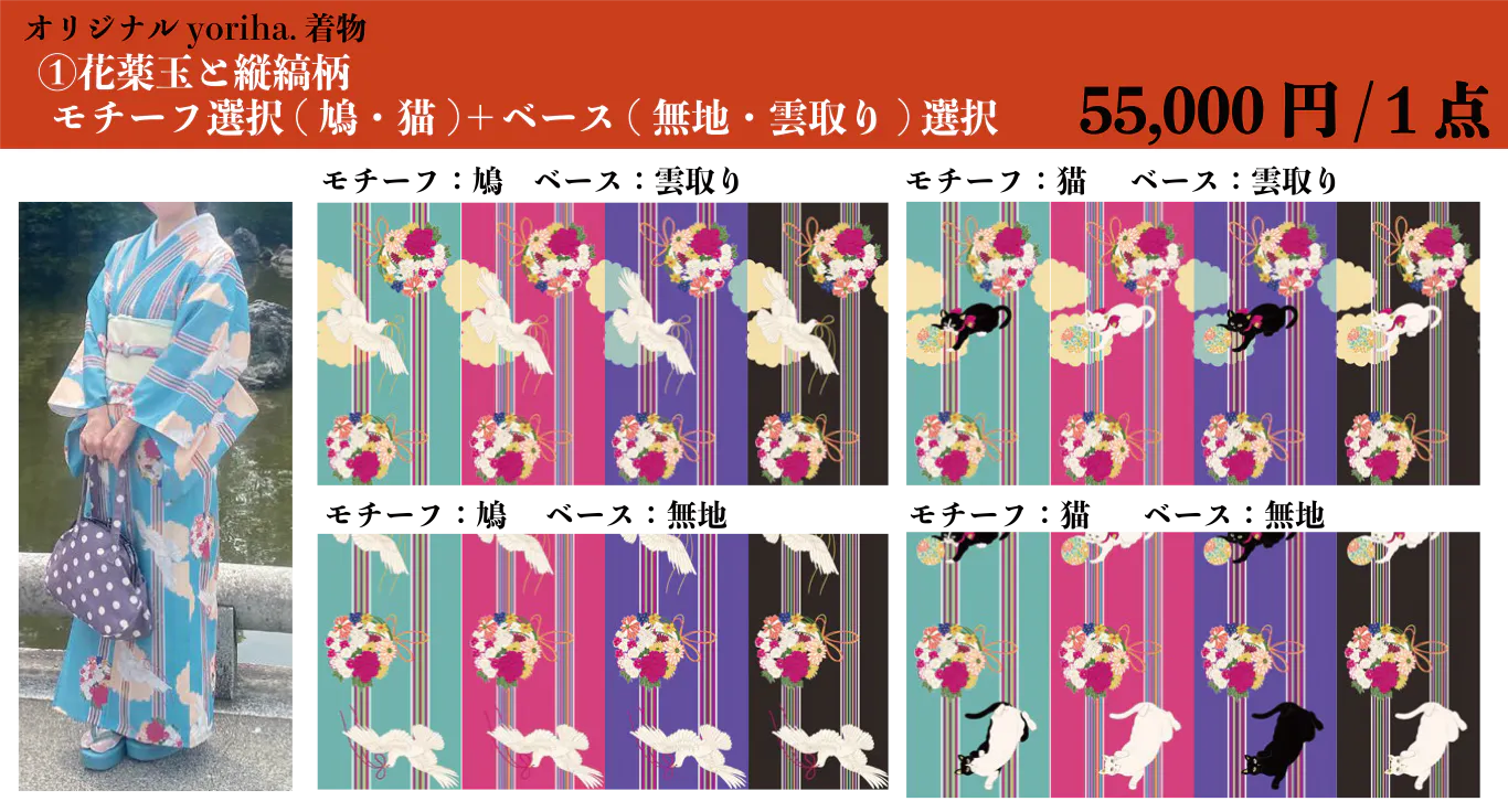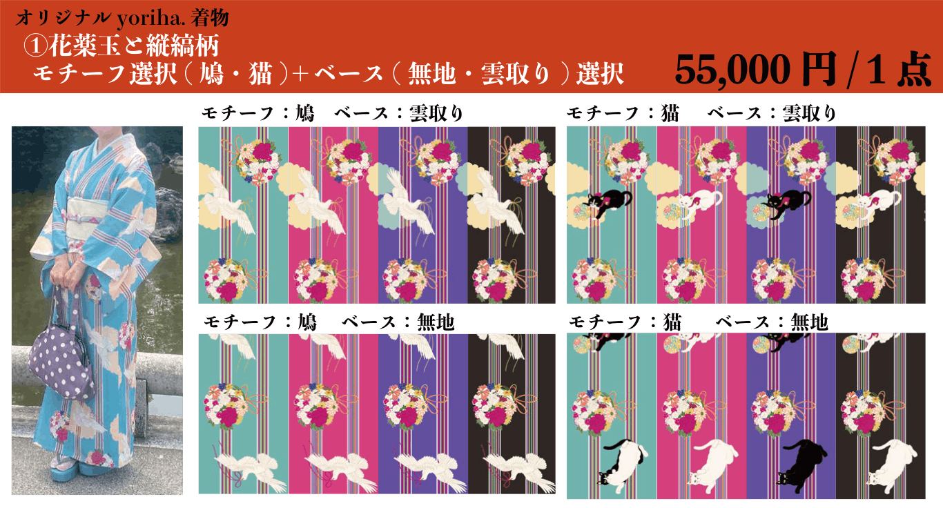 ⓵ <花薬玉と縦縞柄> の 「モチーフ」、「ベース」、「カラー」を選択して単衣着物を仕立てる。