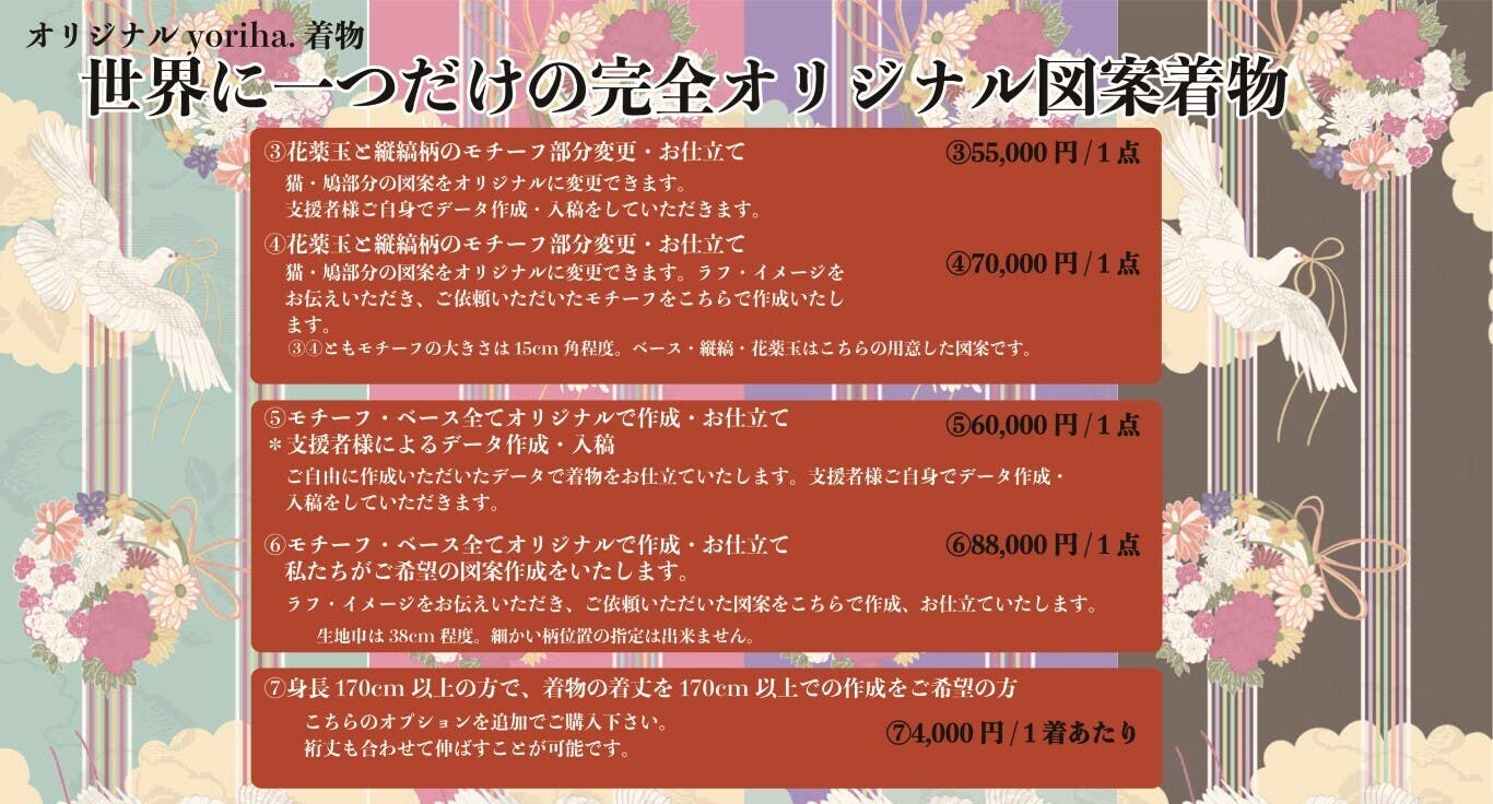 4.③、④、⑤、⑥のリターン品の納期につきましては仕立てに入る段階にてご提示いたします。