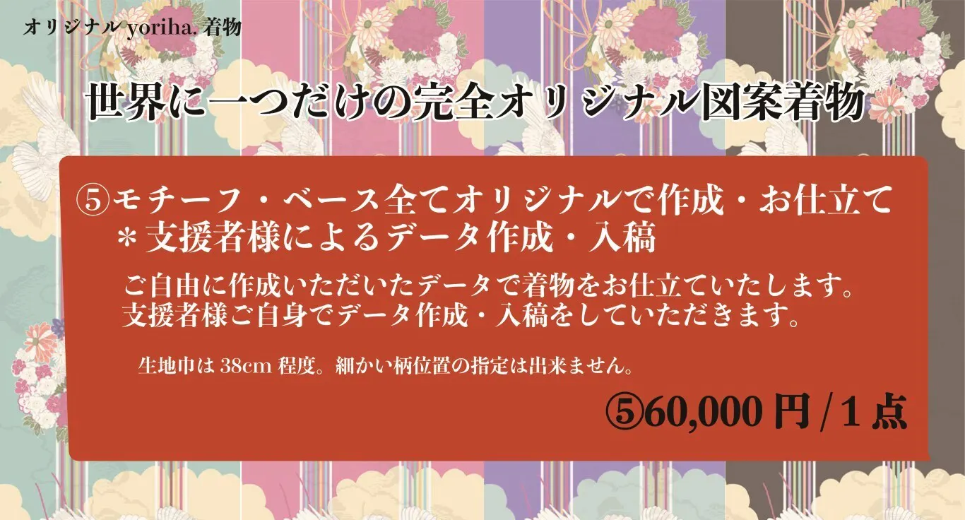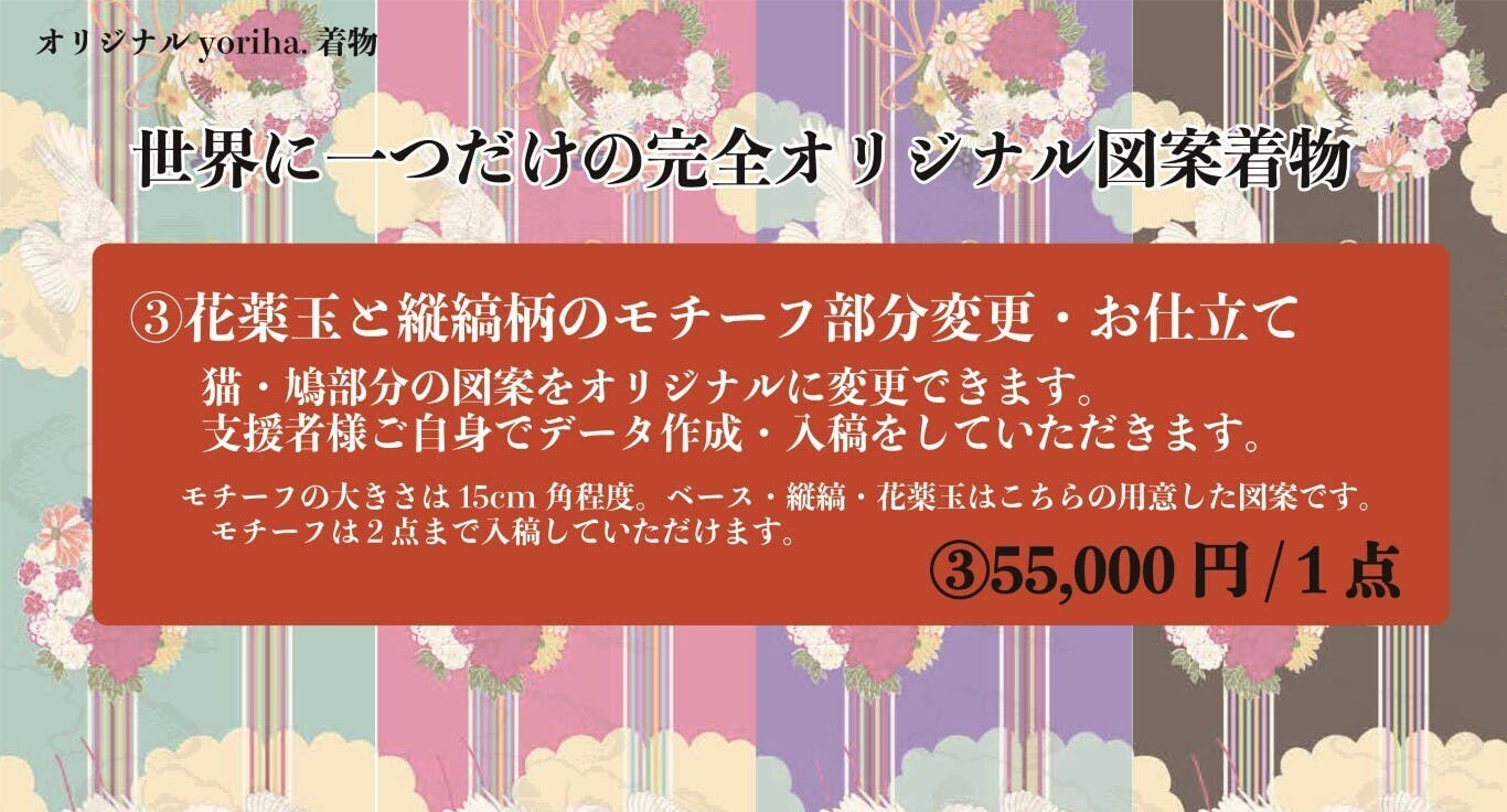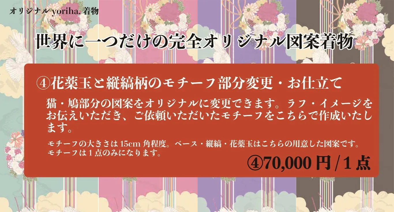 ③ <花薬玉と縦縞柄> の 「既存モチーフ」部分を「オリジナル柄」に変更して単衣着物を仕立てる。