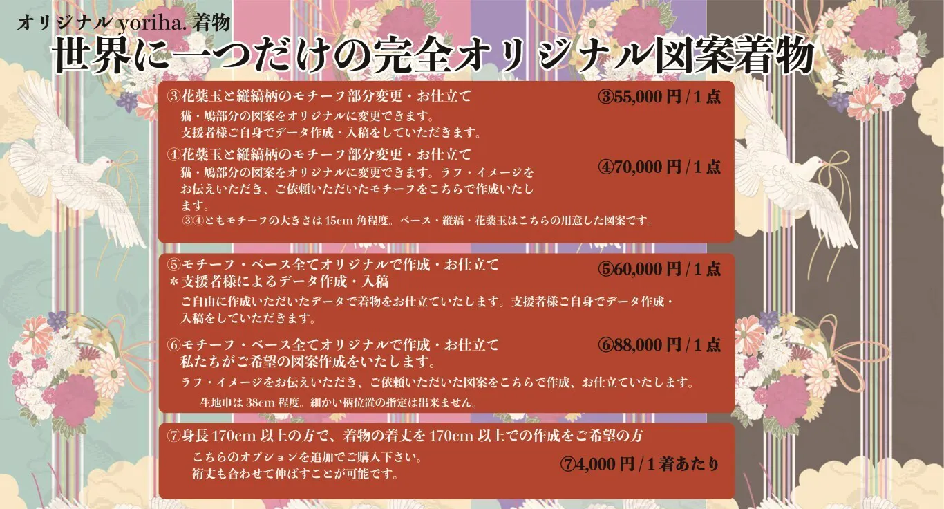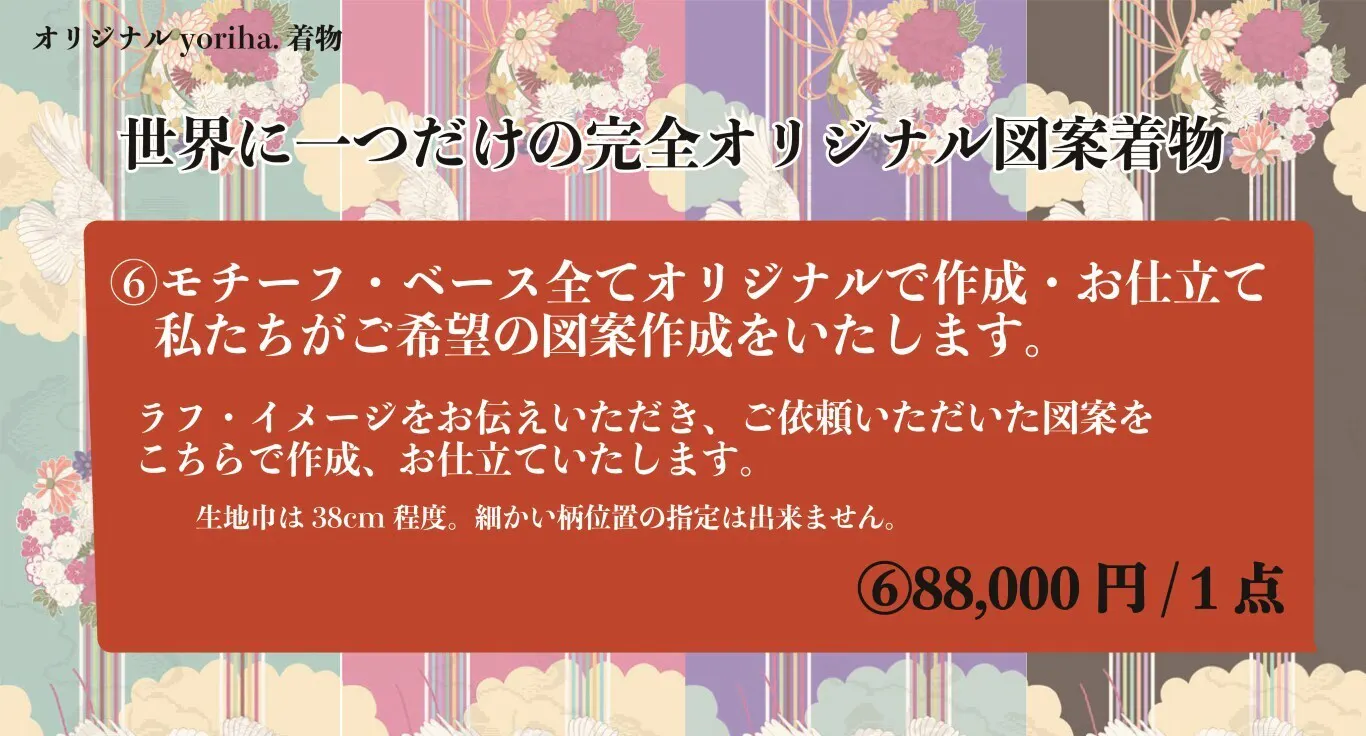 ⑥「モチーフ」、「ベース」、「カラー」全てオリジナル仕様に変更して単衣着物を仕立てる。