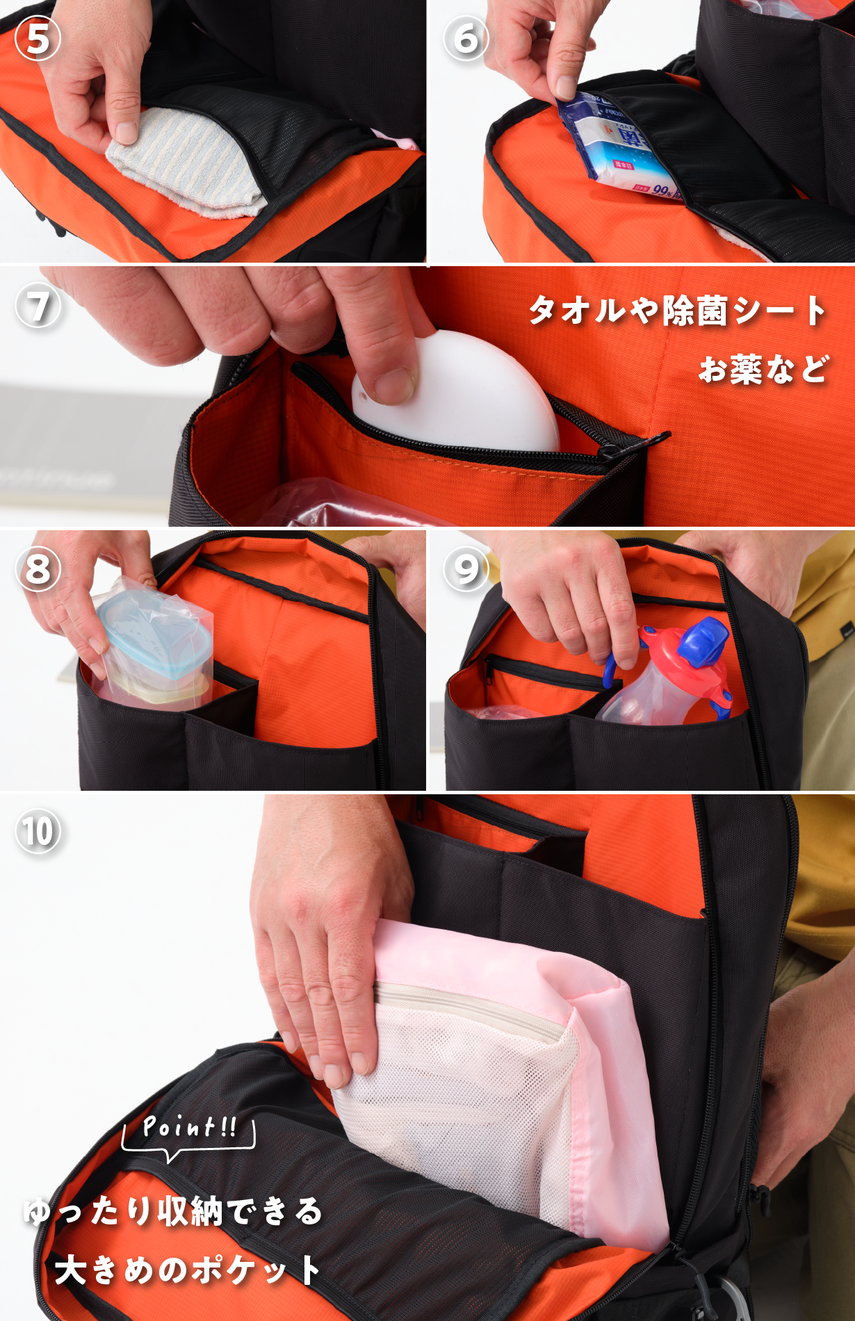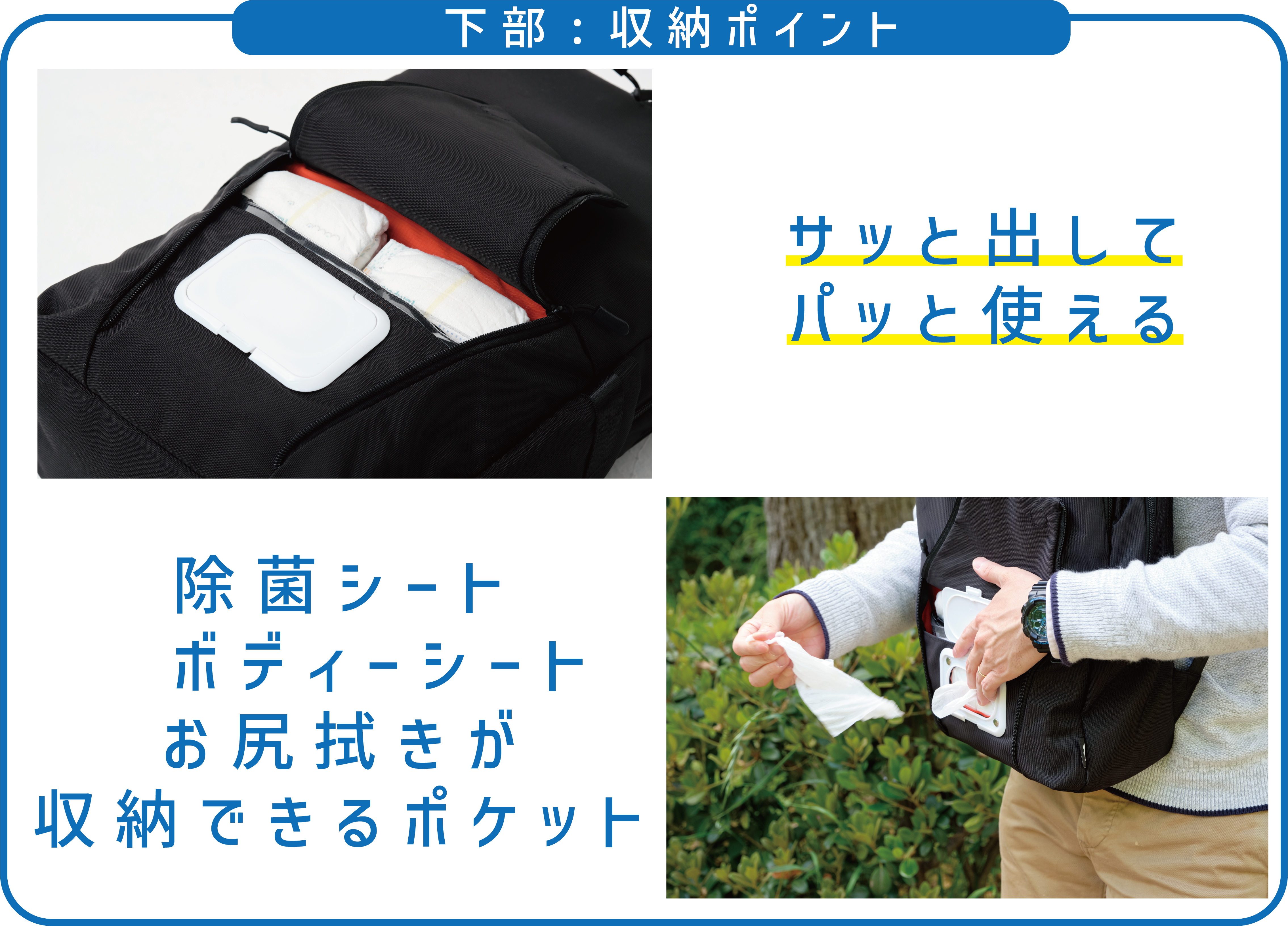 KABAGの代名詞であるアイデア収納。ありそうでなかった「パッと出せて、サッと使える」機能。お子さんが大きくるなるとボディーシートなど収納することができます。※前面にある2本ファスナーの間を握ってグッと引き上げると、ウェットティッシュ&おむつの収納ポケットが現れます(ウェットティッシュは50枚用まで収納可能)。