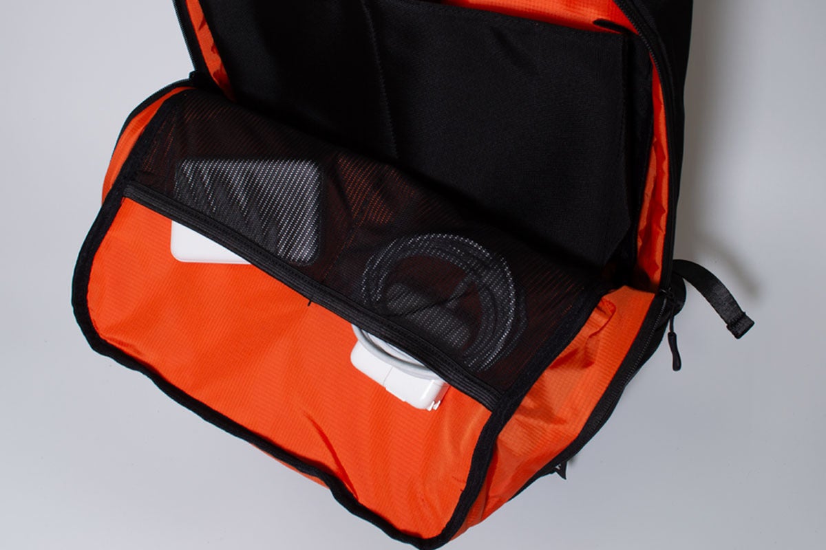 頻繁に出し入れするのものは、すぐに手に取れるようにロフトタイプのオープンポケット。使わないときは畳んで使えます。下の部分にはアダプターや頻度の低いものを入れておくと便利です。