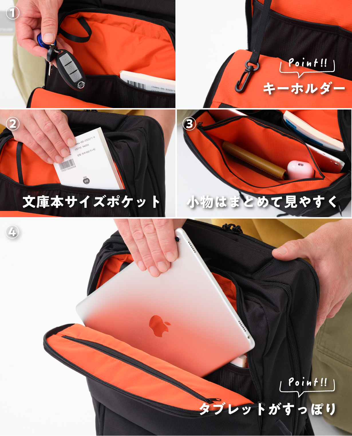 ポケット①にはキーホルダーもついていて、鍵をゴソゴソ探す手間を省きます。ポケット④はタブレットがすっぽり入るサイズ感。