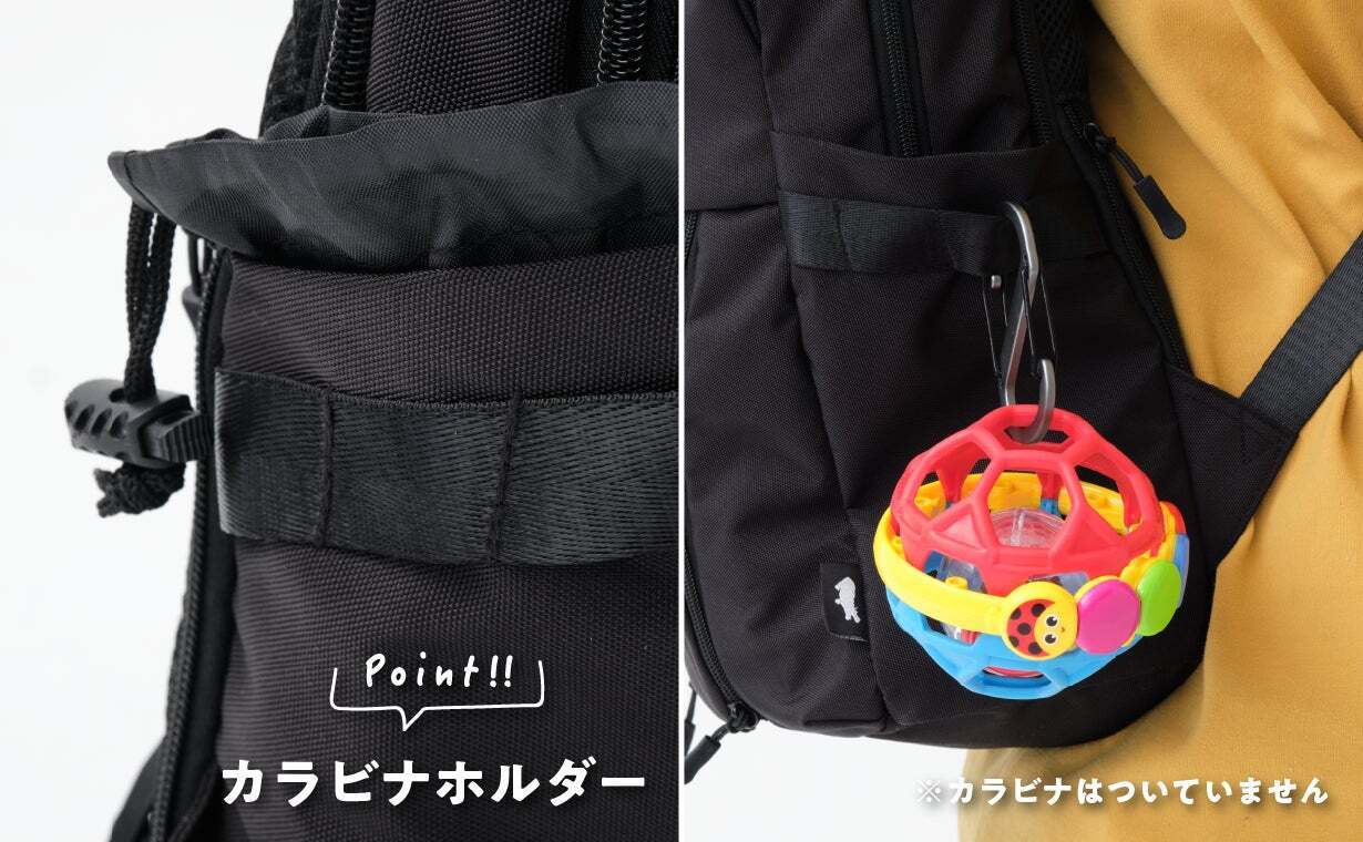 サイドのテープ部分には、カラビナホルダーになっています。リュックにしまうことの出来ない子どもの荷物はここに引っ掛けると便利です。