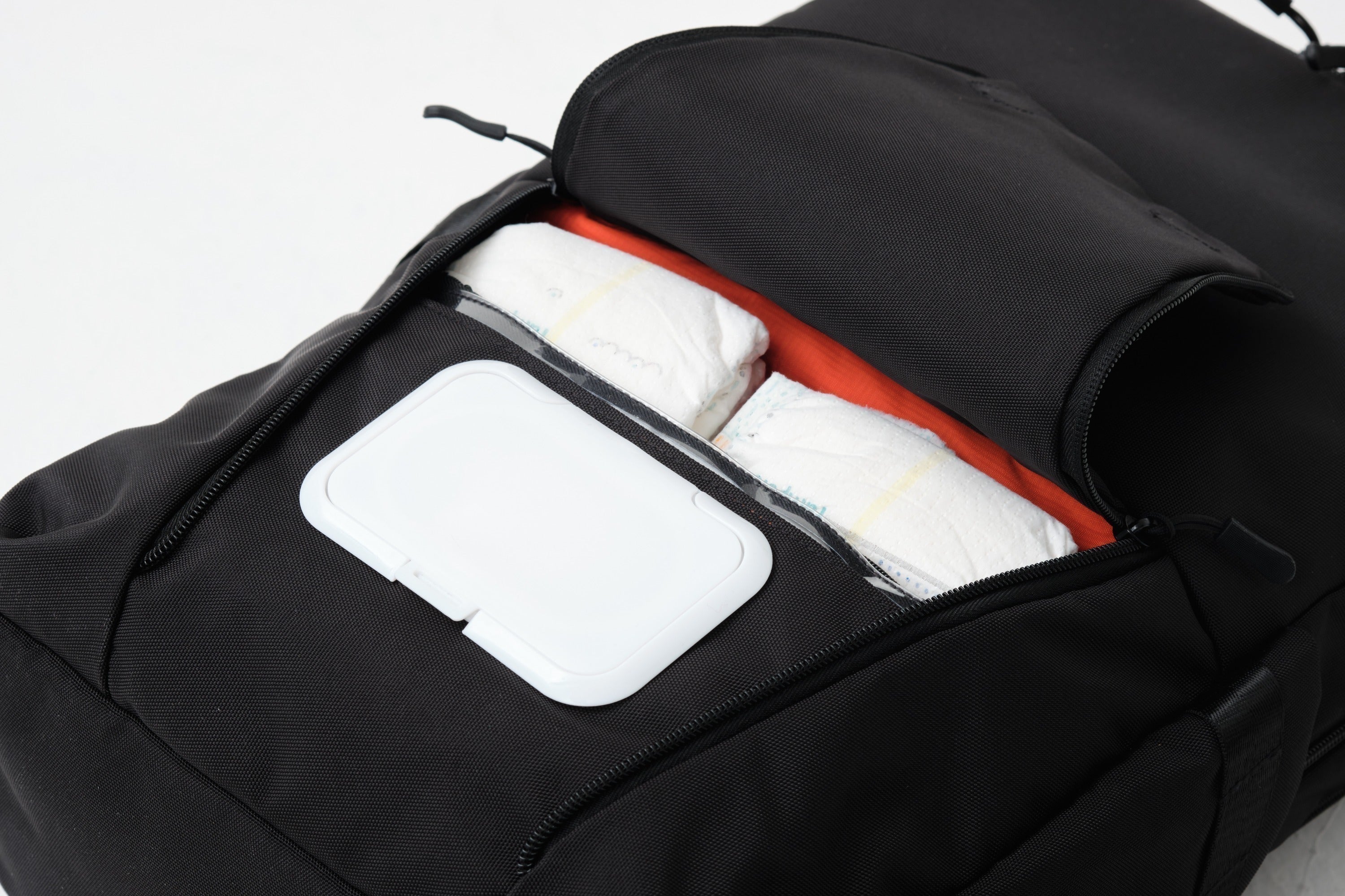 あっと驚く収納もKABAGのポイント。前面にある2本ファスナーの間を握ってグッと引き上げると、ウェットティッシュ&おむつの収納ポケットが現れます(ウェットティッシュは50枚用まで収納可能)。隠れたマグネットでも蓋が閉まるのがポイント。