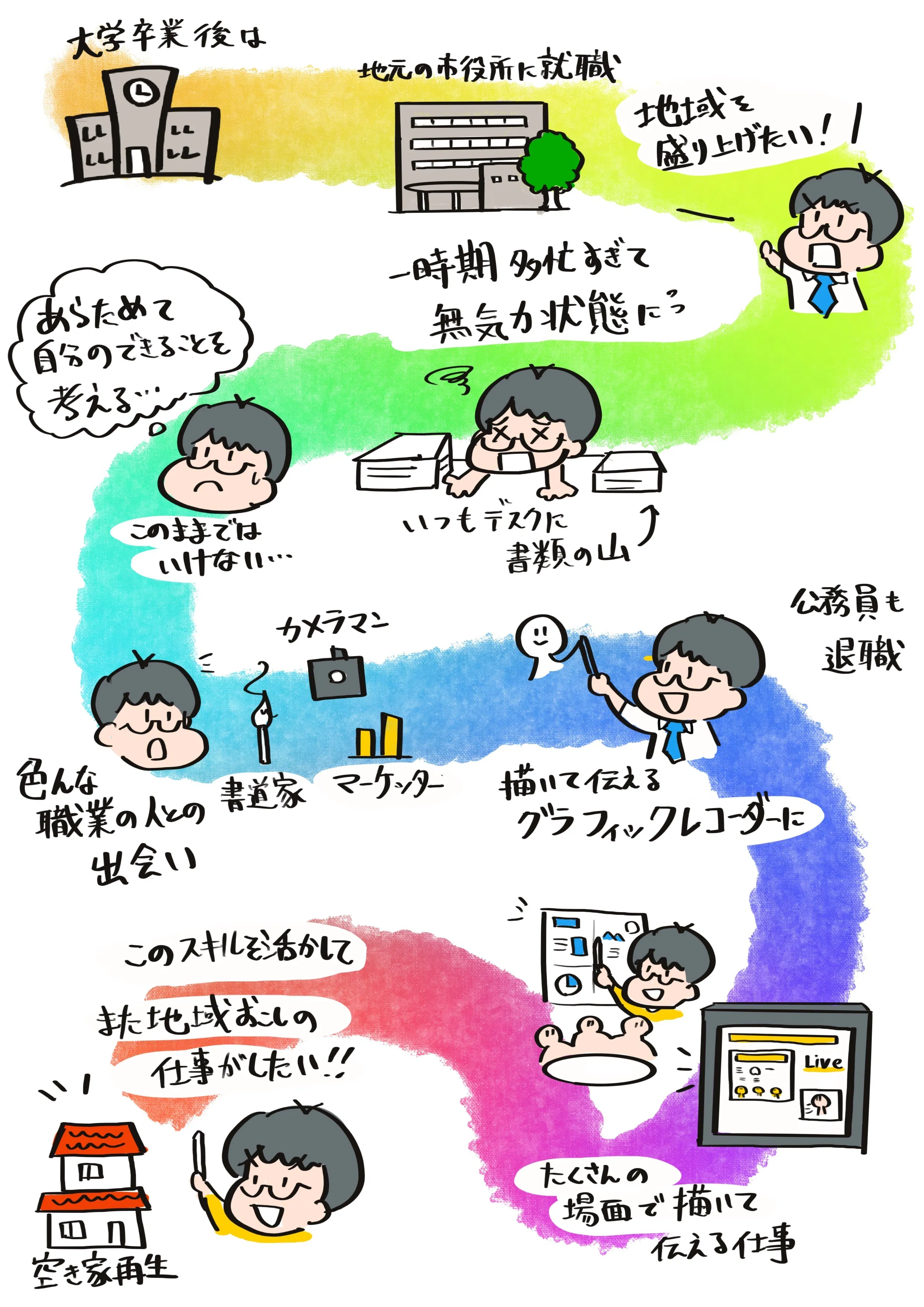 首都大学東京(現東京都立大学)卒業後、埼玉県狭山市に入庁し、学童保育室の運営や文化施設の管理担当などを経験。26歳の時に、グラフィックレコーディング(以下グラレコ)というイラストで話し合いをまとめるスキルに出会い、独学で学び始めます。その後、2021年4月に公務員を退職し、グラレコを中心としたフリーランスとして、2年間の働いていました。2022年には、朝の情報番組である日本テレビ「スッキリ」にて生放送のグラレコを担当しました。