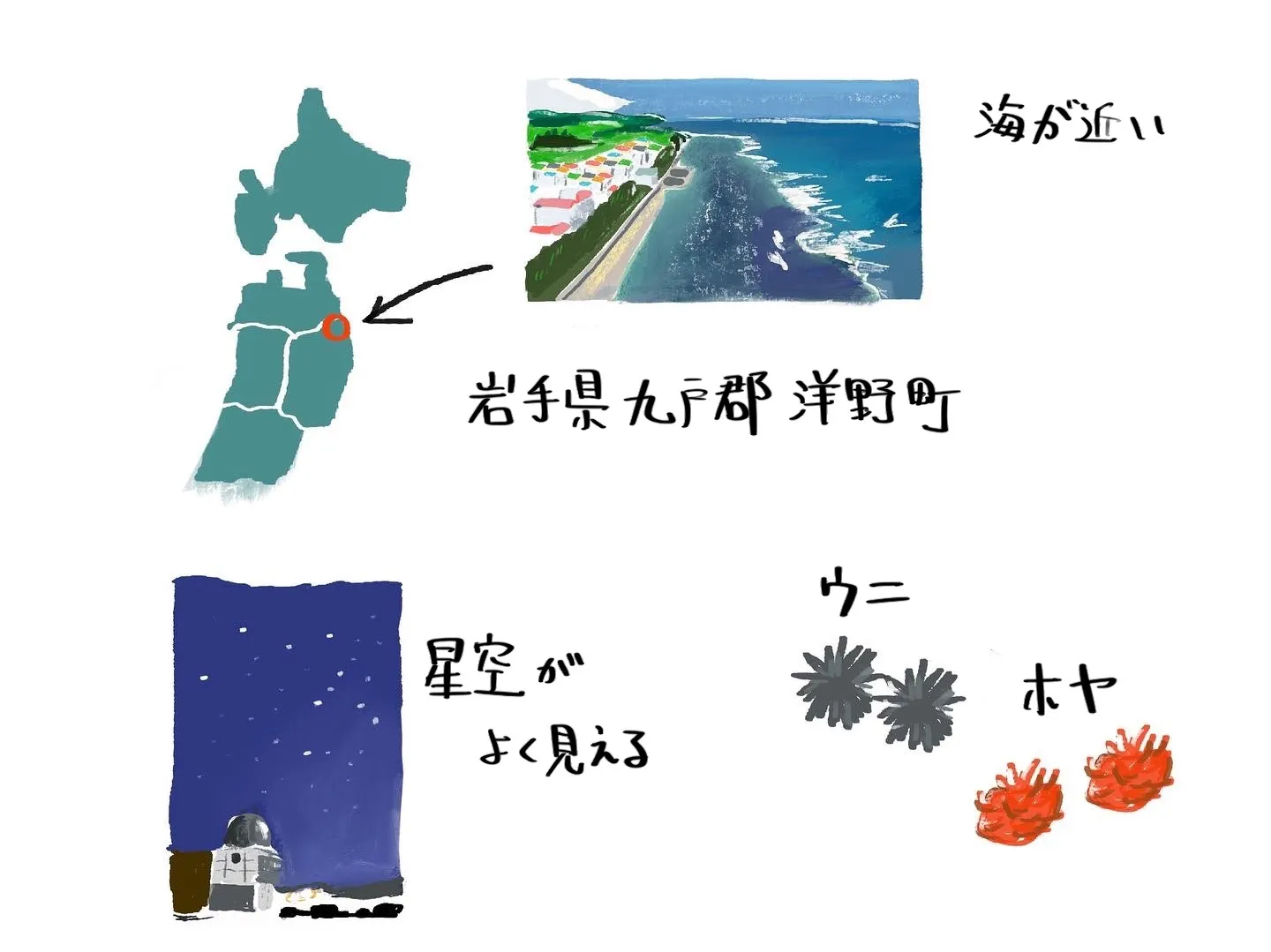 元公務員の経験から「イラストによる可視化✖️地域おこし」の可能性を探るべく、新しい働き方を模索していき、地域おこし協力隊として活動していくことを決意。地域を調べていく中で、自然に溢れ、海産物の美味しい洋野町に魅力を感じ、何度か地域を訪れるままに地域おこし協力隊に応募。2023年4月から空き家の利活用担当として働き始めました。