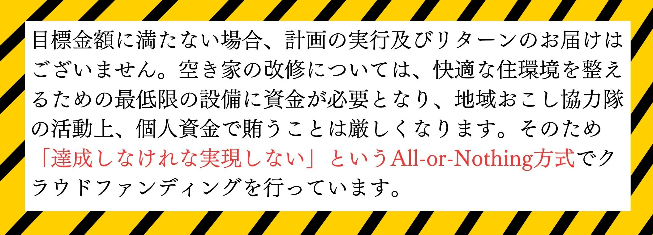 本プロジェクトはAll-or-Nothing方式で実施します。目標金額に満たない場合、計画の実行及びリターンのお届けはございません。