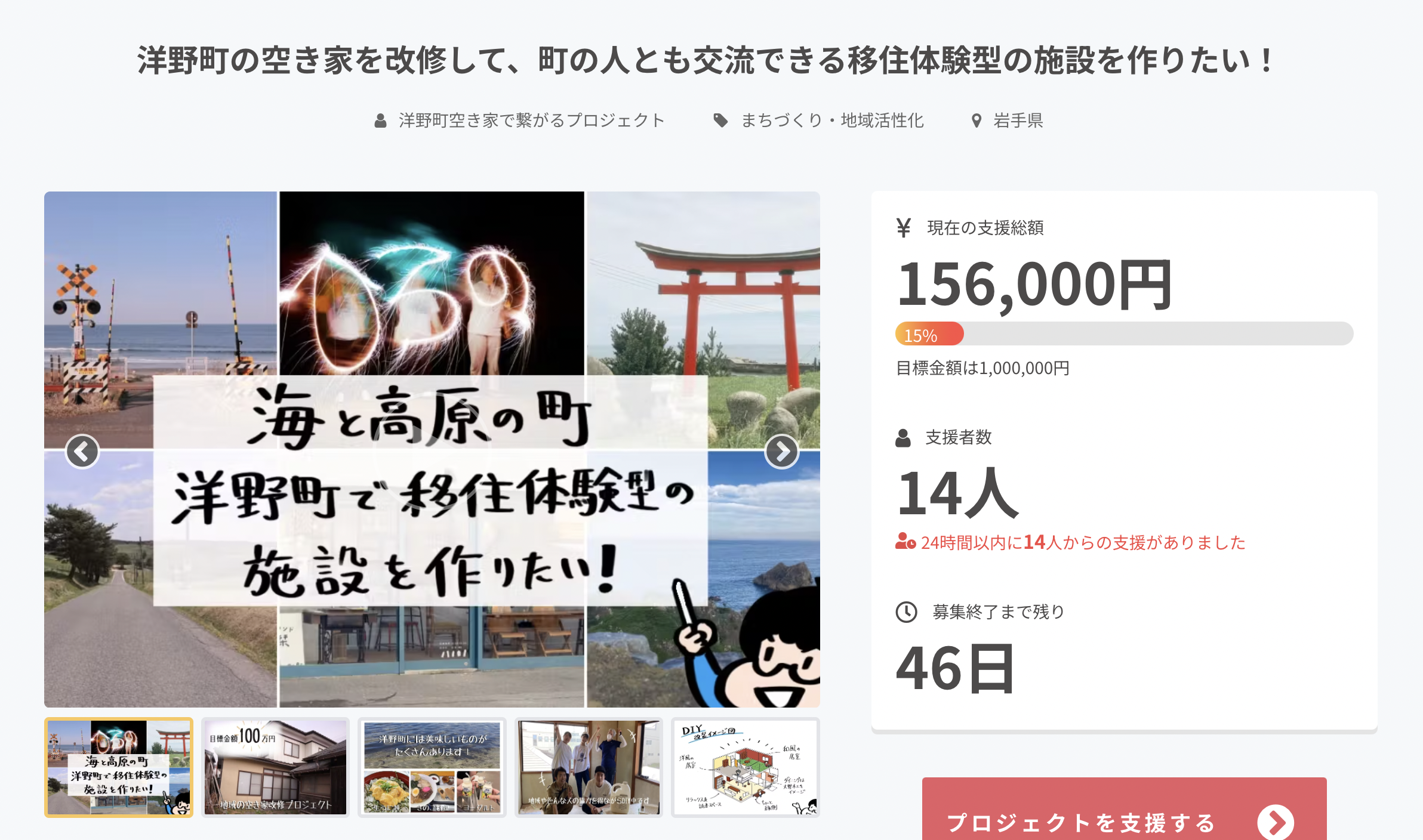 こんばんは。洋野町地域おこし協力隊、とんぷです。おかげさまで本日30%を越すことができました。今回は支援いただいた皆さまのコメントを紹介したいと思います。msy63様応援しています!頑張ってください!→ありがとうございます!しっかりと洋野町に交流拠点として場を作れるように頑張ります!user_a210bd3a87e4様応援してます。今後も何かでお役に立てればと思っております。プロジェクト成功させてください!→ありがとうございます!ご支援とても嬉しいです!成功できるように最後まで頑張ります!mariho ueno様微力ながら応援しています。スピード感が流石です、頑張ってください!→上野さんありがとうございます!できれば年内に完成させたいと思っています!まだまだ先は長いですが、どうぞよろしくお願いいたします!ayareco様とんぷさんの次のご活躍とても楽しみにしています!応援してますいつか家族で遊びに行かせてください!→あやさんありがとうございます!ぜひぜひ!おこしの際はご連絡ください!洋野町や岩手県をご案内します!user_b95a6d3e02e4様応援しています!頑張ってください!→三輪さんありがとうございます!また狭山市に帰ってくることもありますので、その際にまた近況お話ししますね!kubotanao様とんぷさんとは埼玉県繋がりで知り合いましたが、仕事の幅を広げ、初めての土地で新しいチャレンジをされている姿がとてもかっこいいです。これからも応援しています!(たまには埼玉に帰ってきてくださいね)→ナオさんありがとうございます!埼玉に戻ってくる時はまたご連絡しますので、またぜひお礼と、お話させてくださいytumi様山岸さん、いつもありがとうございます!応援してます!!→積田さんありがとうございます!こちらこそです!引き続きシェアエコ協会にてよろしくお願いいたします!gurareko hide様とんぷさん がんばれーー そのうち遊びに行きますーーお身体ご自愛くださーい→ヒデさんありがとうございます!ぜひ広野町でお会いしましょう!お互いの描き方などシェアできれば幸いですMiyasato Saki様とんぷさーん!いつもグラレコ のお仕事でお世話してくれてありがとうございます!空き家の再活用について、色々話せたら嬉しいですし(わたしの姉がその分野ですが)、グラレコ でもまた一緒に何かできたら嬉しいです♪クラファンの成功、応援しています!そして、リターンも使わせていただいて岩手にも行けるといいな~→さきさんありがとうございます!こちらこそいつもお手伝いいただき、ありがとうございます!空き家活用の情報交換しましょー!ぜひ洋野町へ!user_c7cc1171a3e4様応援しています!頑張ってください!→ありがとうございます!洋野町の交流拠点をしっかり作れるように頑張っていきます!完成した際はぜひ見に来てください!ayachin422様応援しています!頑張ってください!→あやちゃんありがとう!関西にもいく機会またあると思うので、その時には連絡します!直接お礼ができたら幸いです!go1010様行政との折衝うまくいきますように。応援しています!頑張ってください!→剛さんありがとうございます!硬くなりすぎないような場所が作れるとように意識しつつ、地域で協力できるように頑張りたいと思います。Walking MASAO様とんぷくん、プロジェクト楽しみにしています。紹介ページ見て、洋野町にも行きたくなりました。「みちのく潮風トレイル」を歩くときに寄らせてもらいますね。頑張ってください!→マサヲさん色々と情報もありがとうございました!ぜひ洋野町とトレイル来てください!洋野町のグルメでしたらお任せくださいね!oohnochu2023様応援しています!頑張ってください!同じく洋野町にかかわる者です! わたしたちも現在、クラウドファンディングに挑戦中です! いっしょに頑張っていきましょうという思いを込めて、わずかですが支援します!→ありがとうございます!学生の皆さんの青春のために地域で頑張っている方がいると知り、胸が熱くなりました!近いうちにご挨拶に伺います!s0404061様とんぷさんの想いが形になるのを楽しみにしています!応援しています!→ありがとうございます!僕の想いと地域の想いを交えながら、色んな人に愛される場所にしたいと思います!user_77fc797266d4様応援しています!頑張ってください!→ありがとうございます!初めてのクラウドファンディングにつき、ご支援いただけたことがとても嬉しいです!最後まで頑張ります!haruna03様いつも前向きに自分の道を進んでいるともさんを尊敬しています!最後まで頑張ってください!→大底さんありがとうございます!おかげさまで、下ではなく、前を向けるようにさせてもらいました!最後まで頑張ります!Naoeda_Kanako様とんぷさん!インスタで活動のご様子拝見しています。応援しています!→かなこさんありがとうございます!インスタも随時日常を更新していきます!素敵な場所を作れるようにと思っていますが、洋野町の気になる場所などありましたら、取り上げて発信したいと思いますので、引き続きどうぞよろしくお願いします