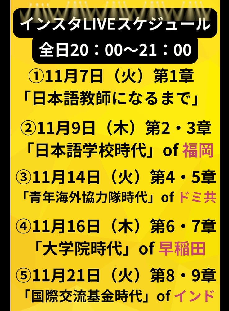 私の人となりや本の魅力をより知っていただくために、定期的にインスタLIVEを行うことにしました。スケジュールは以下のとおりです。