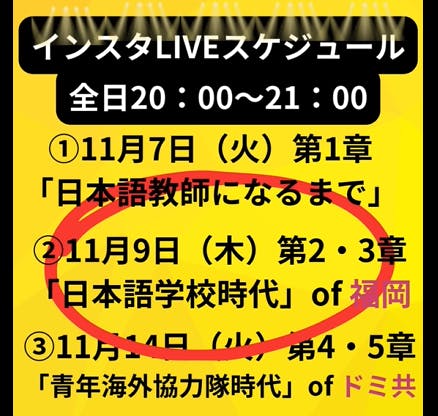 そこで、明日!インスタLIVE第2・3章編を、20時から行います!テーマは「日本語学校時代of福岡」。前半はいつもどおり本の内容を少し紹介しつつ、後半はついにゲストが登場します!