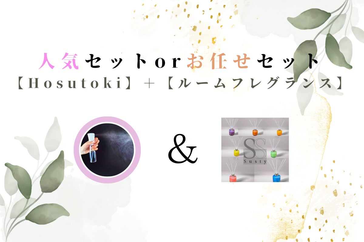 人気の匂い・お任せセット: 干す時専用ミスト【Hostoki】とリードディフューザーの限定セットを人気セットorお任せセットでご提供。数量限定