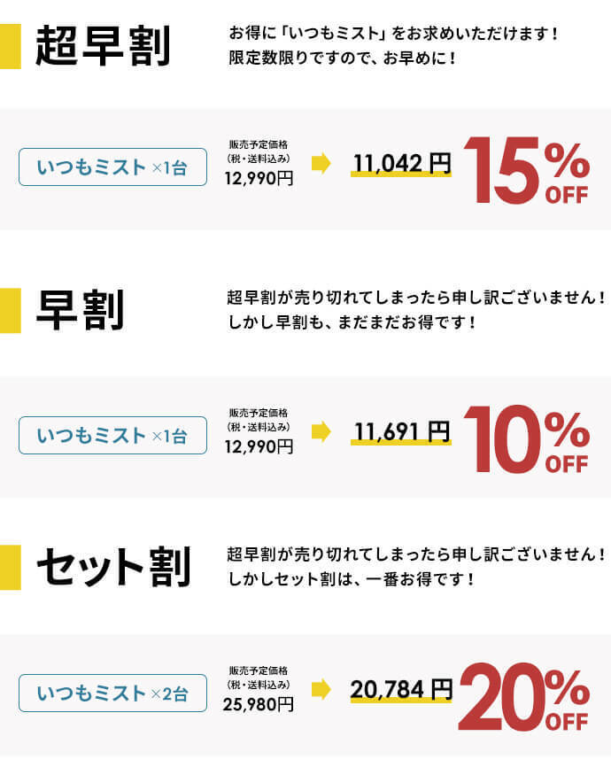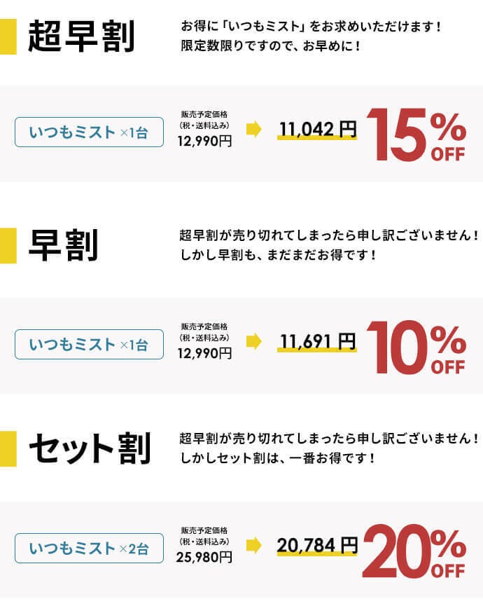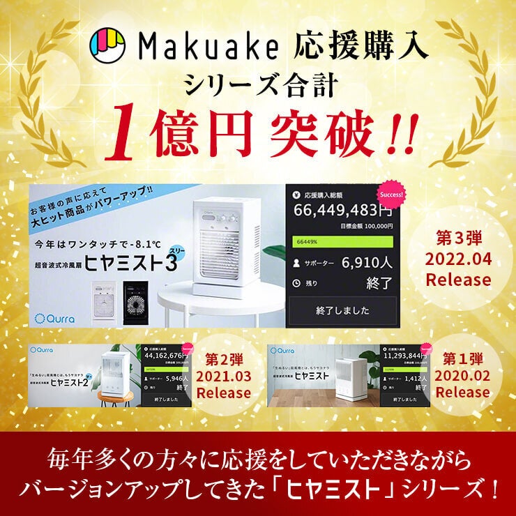 2023/07/25 13:39初代ヒヤミスト、ヒヤミスト2、ヒヤミスト3と毎年バージョンを変えてきたヒヤミストシリーズの最終形態ともいえる「いつもミスト」の登場です!!すでに一般販売中ですが、お得なリターンはCAMPFIREだけ!ぜひご検討ください。 もっと見る