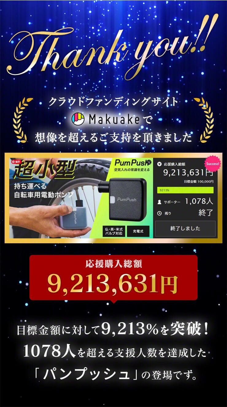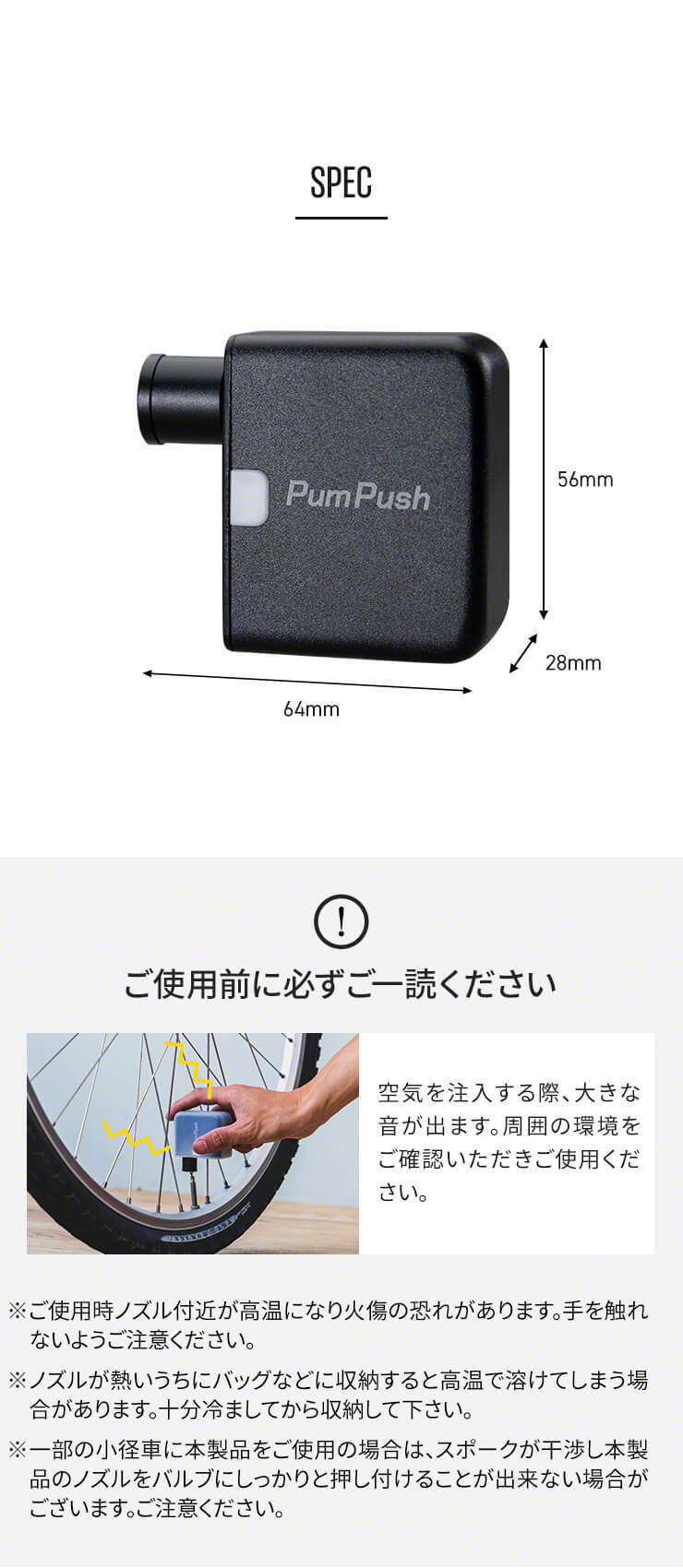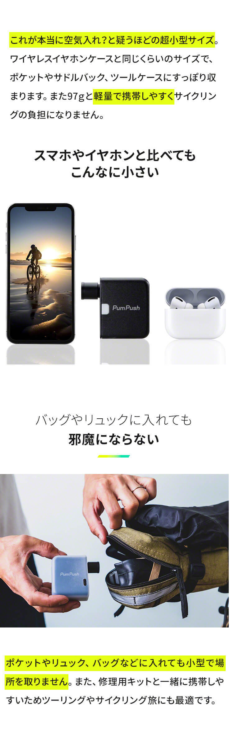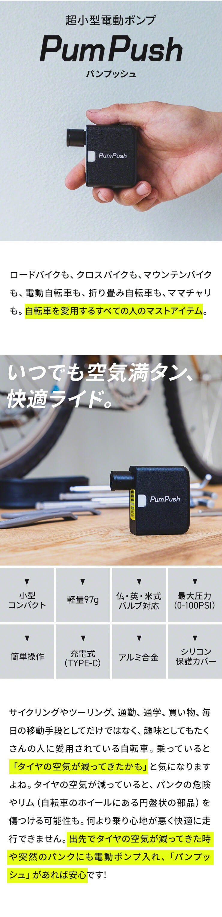 2023/07/27 12:31Makuakeで1000人を突破した、大人気の自転車用の電動空気入れ「PumPush」がCAMPFIREに登場です!初回の入荷分はすでにほぼ完売。次回入荷分をこちらのプロジェクトで販売します。PumPush(パンプッシュ)は、その小ささと軽さにより、ポケットやバッグに簡単に収納でき、サイクリングやツーリング中にタイヤの空気が減ったり、パンクしたりした場合に役立ちます。また、小さなサイズにもかかわらず、このポンプはパワフルで、タイヤ2本分の空気をしっかりと注入することができます。独自のノズル設計により、米式、仏式、英式のバルブに対応しています。また、片手で簡単に空気を注入することができ、女性でも簡単に取り扱うことが可能です。さらに、USB充電式で、電源のない場所でもモバイルバッテリー(別売り)から充電することができます。製品名は「電動空気入れ PumPush(パンプッシュ)」。サイズは約64×56×28mm、重量は約97g(本体のみ)です。パッケージ込みの重量は約158gで、連続動作時間は約200秒、充電時間はAC100V、入力電圧/電流は5V/2A、バッテリー容量は7.4V/300mAh、最大空気圧は約100PSIです。ぜひご検討ください! もっと見る