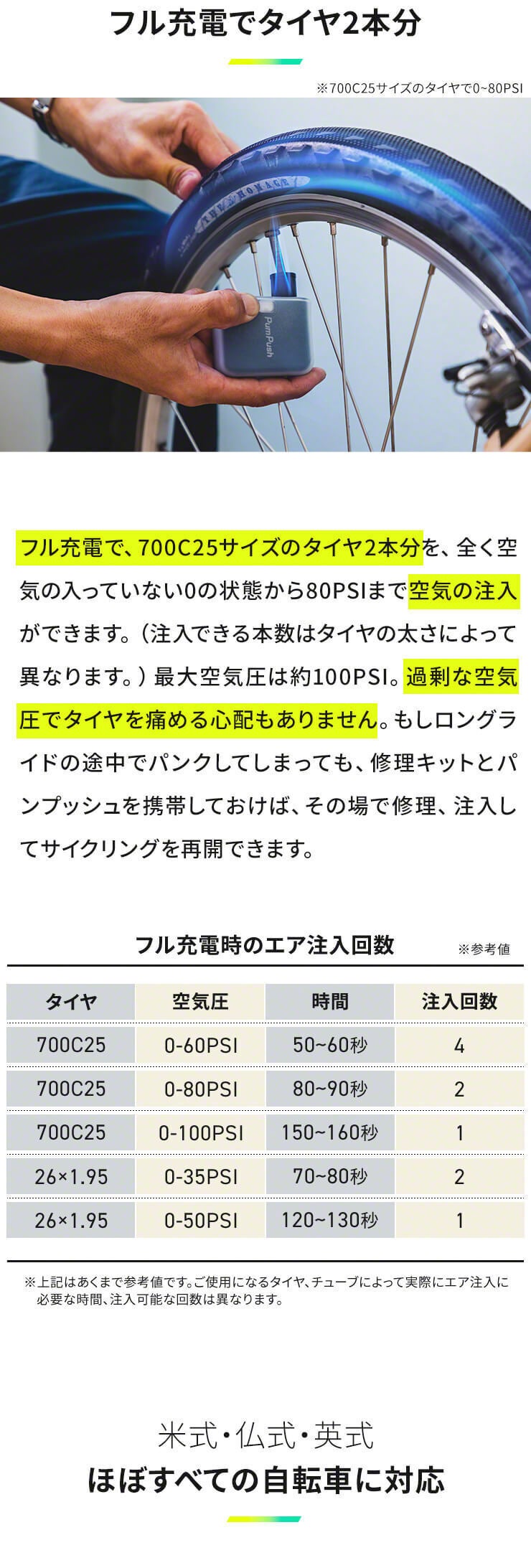 ・小さくてもパワフル!タイヤ2本分の空気がしっかり入る! ※タイヤサイズ 700C25の場合