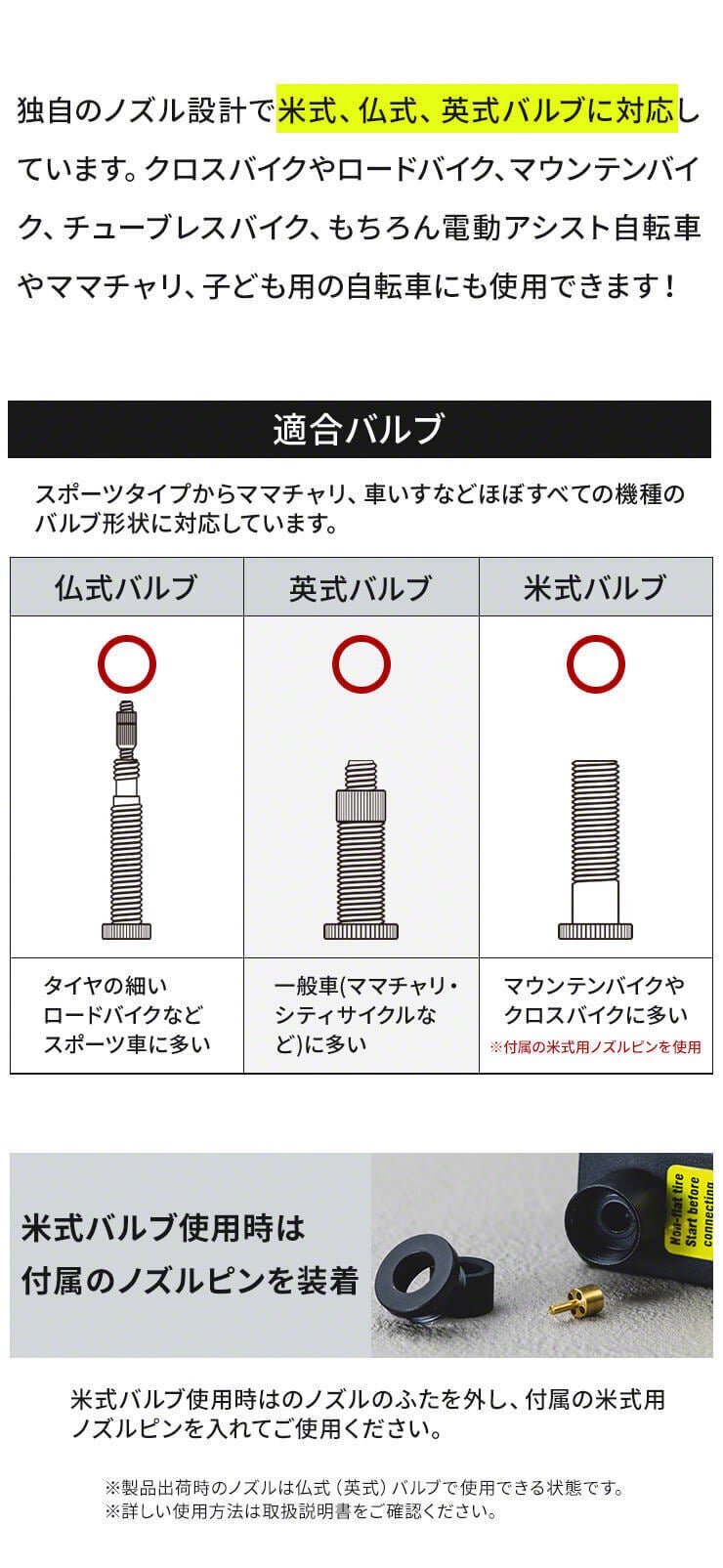 ・独自のノズル設計で米式、仏式、英式バルブに対応!