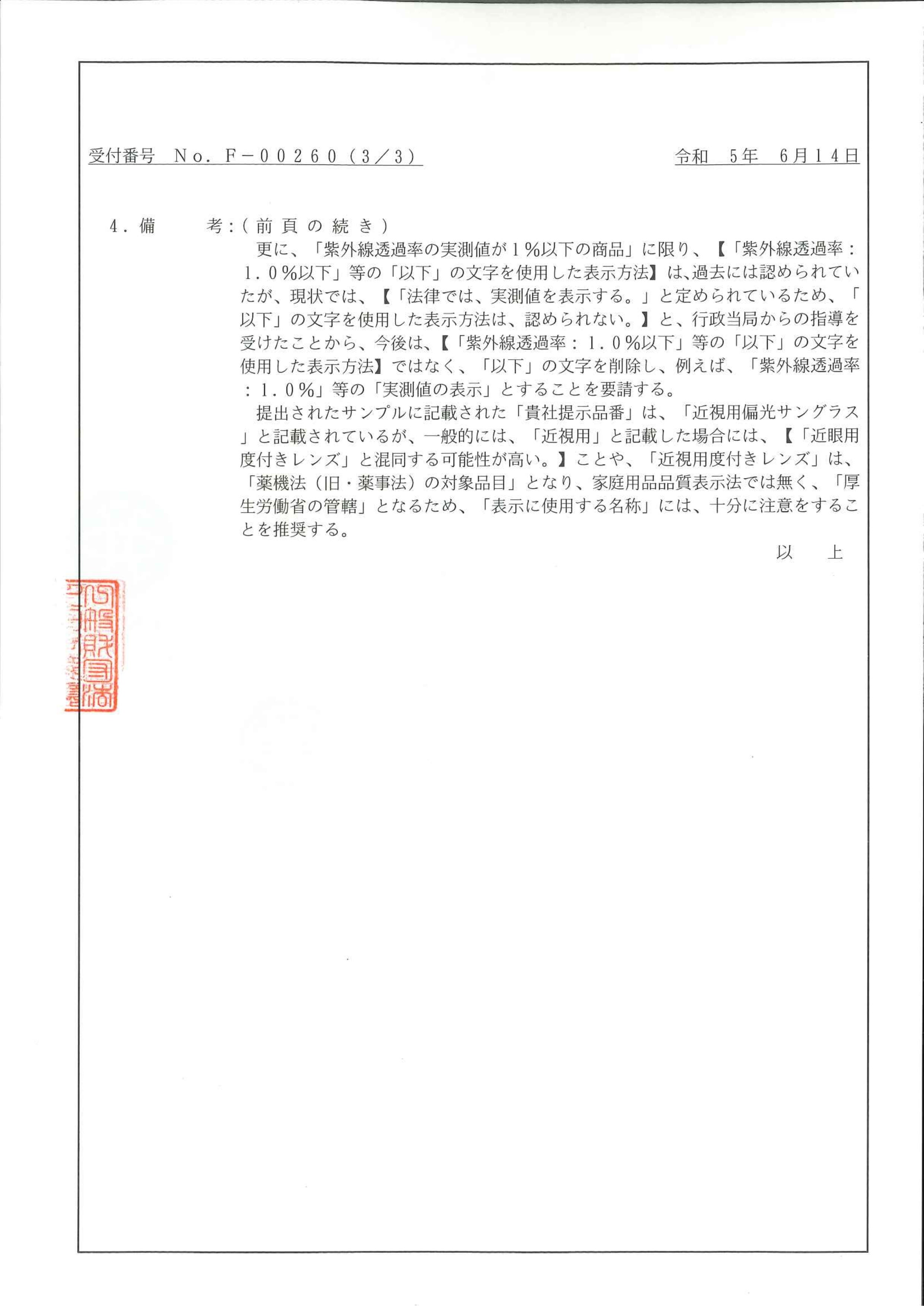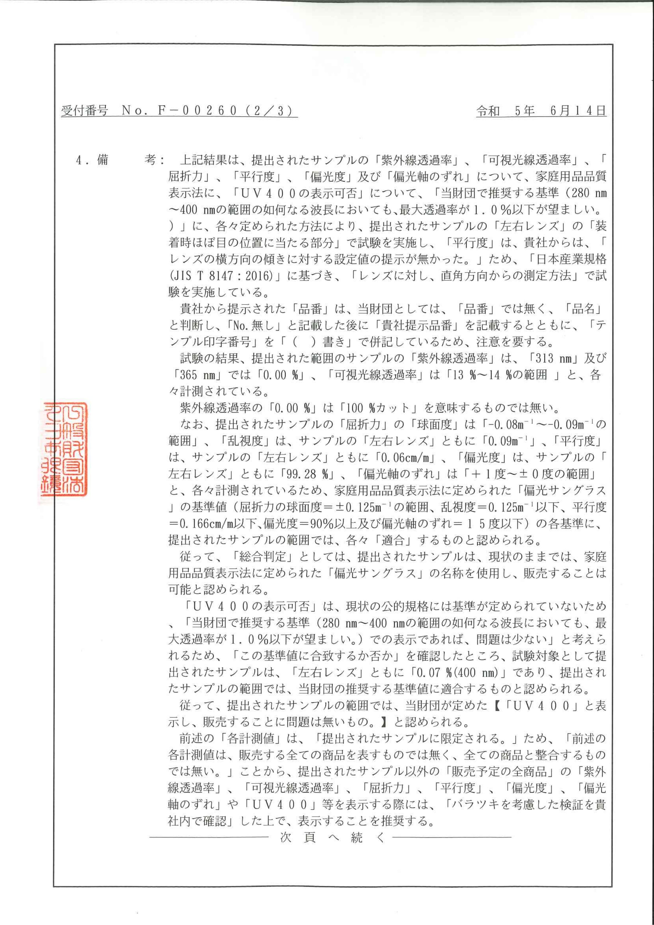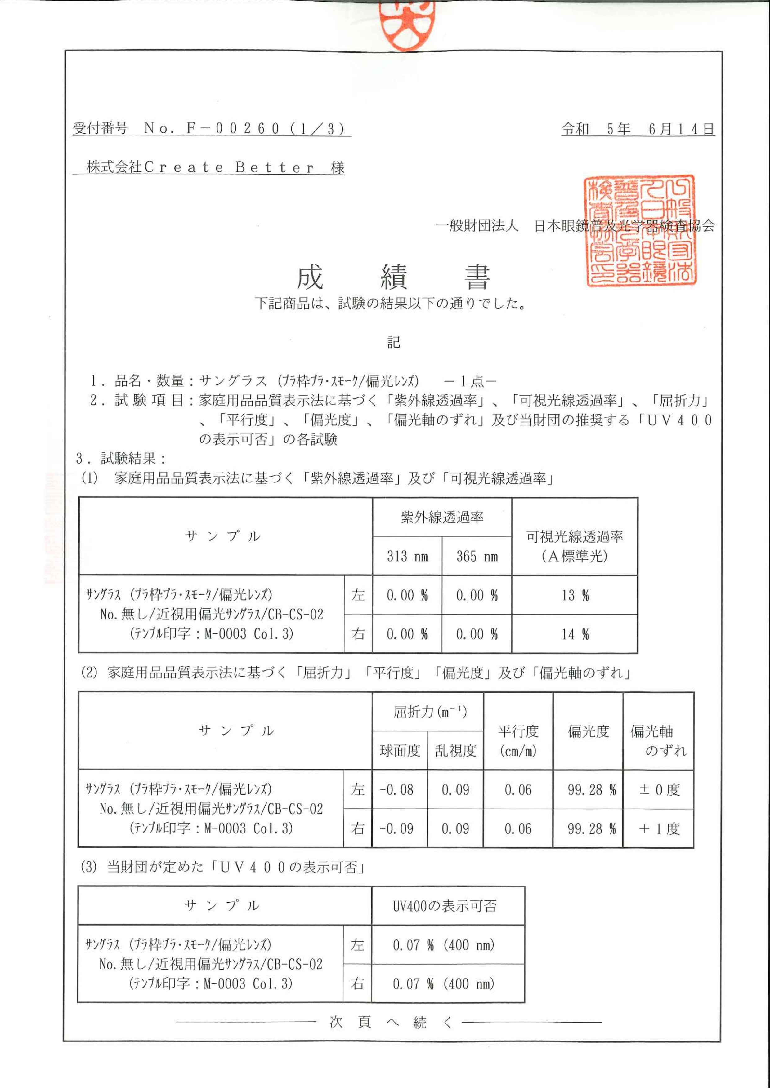 (2023年6月14日株式会社Create Betterから日本眼鏡普及光学器検査協会に提出サンプル限定試験成績書)