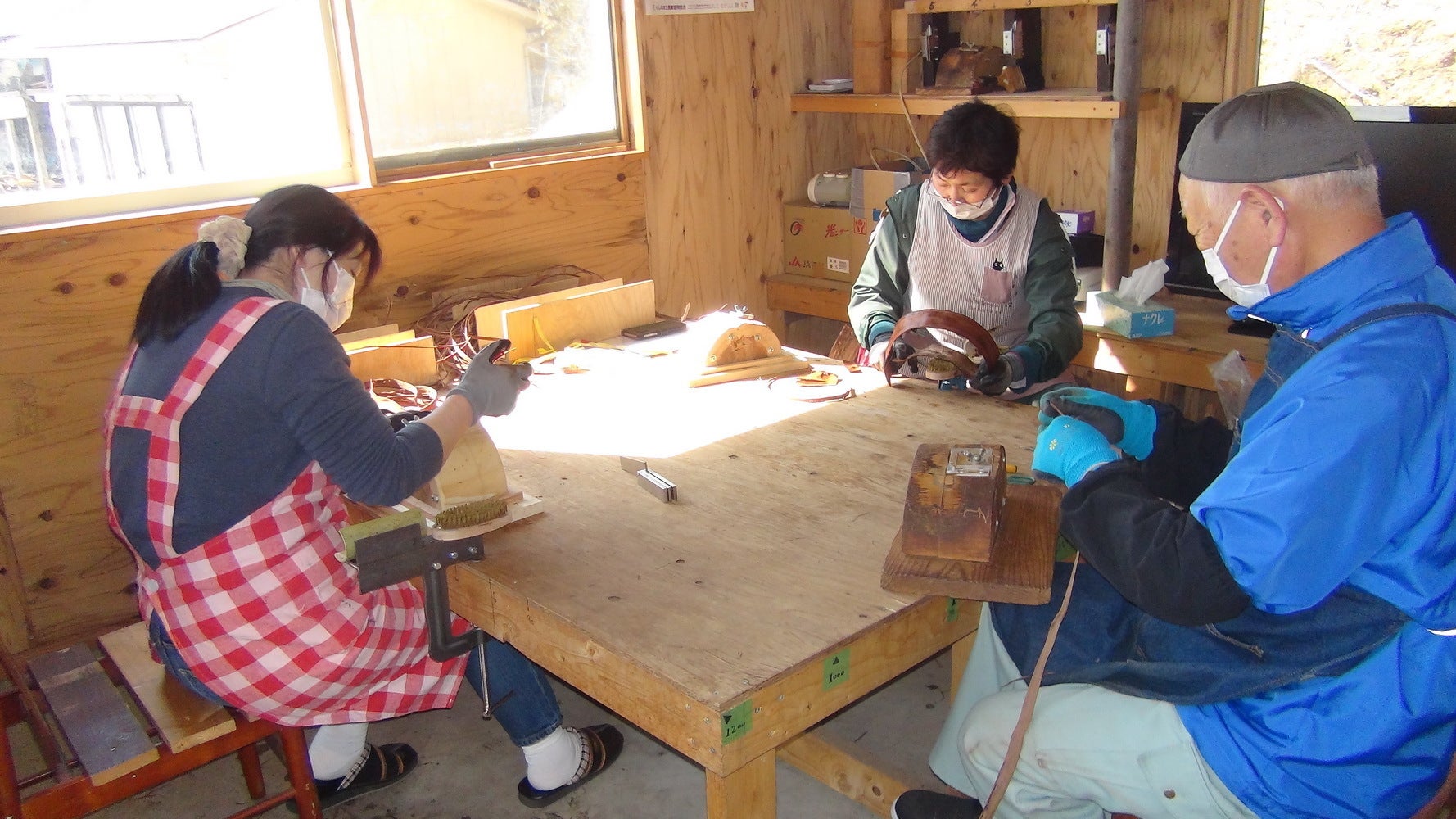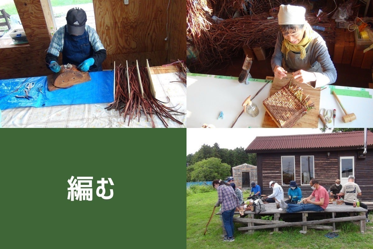 既存の部分を出来るだけ残して改修しました、現在は遠方から講習などに来られる方々の宿泊施設として週末にはカフェ店として営業しています。施設内には山ぶどうやあけび、くるみなどで編んだ篭バッグやアクセサリーなどを展示即売しています。この施設を拠点とし活動します。