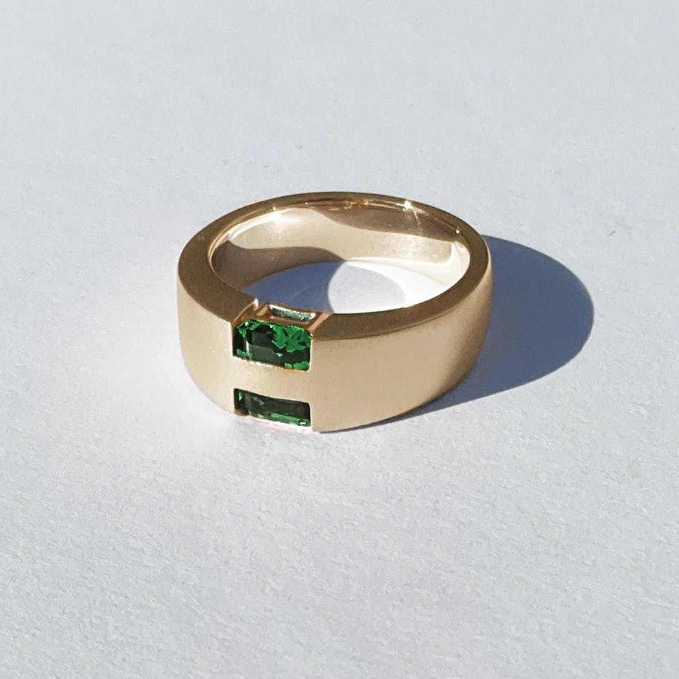 ゴールドとグリーンが鮮やかに映える、美しい組み合わせ。別名「ロシアのエメラルド」とも言われるクロムダイオプサイトをセッティングしており、その大胆な煌めきが、ゴールドに囲まれて悠然と発揮されています。また、マット仕上げでカスタムして頂いているのもこちらのデザインのポイント。地金の色味が濃く表れるマット仕上げは、深い緑色をしたクロムダイオプサイトとも相性が良く、物静かで重厚感のある風合いへと仕上がっています。
