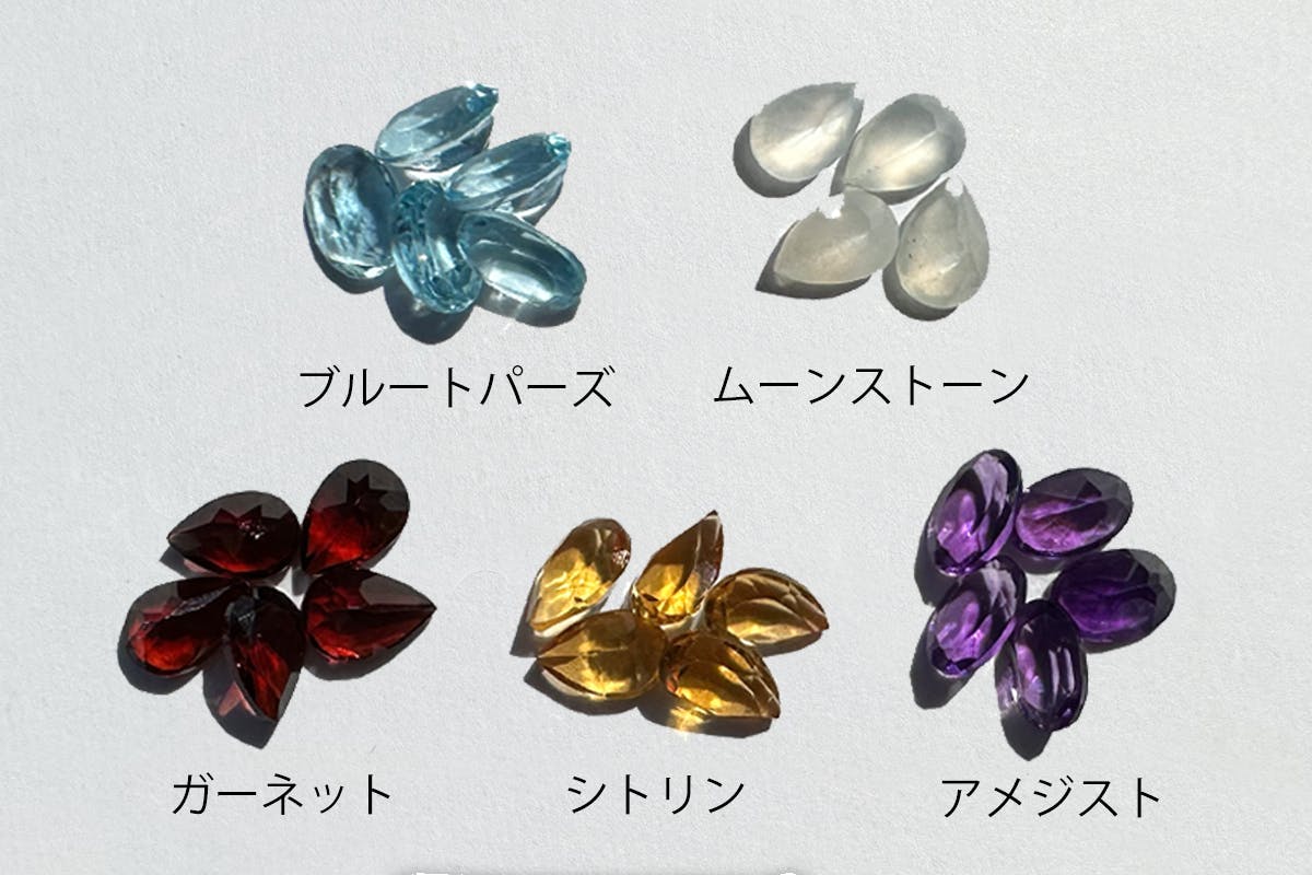 ご用意しているのは、ガーネット、アメジスト、ムーンストーン、ブルートパーズ、シトリンの5種類。