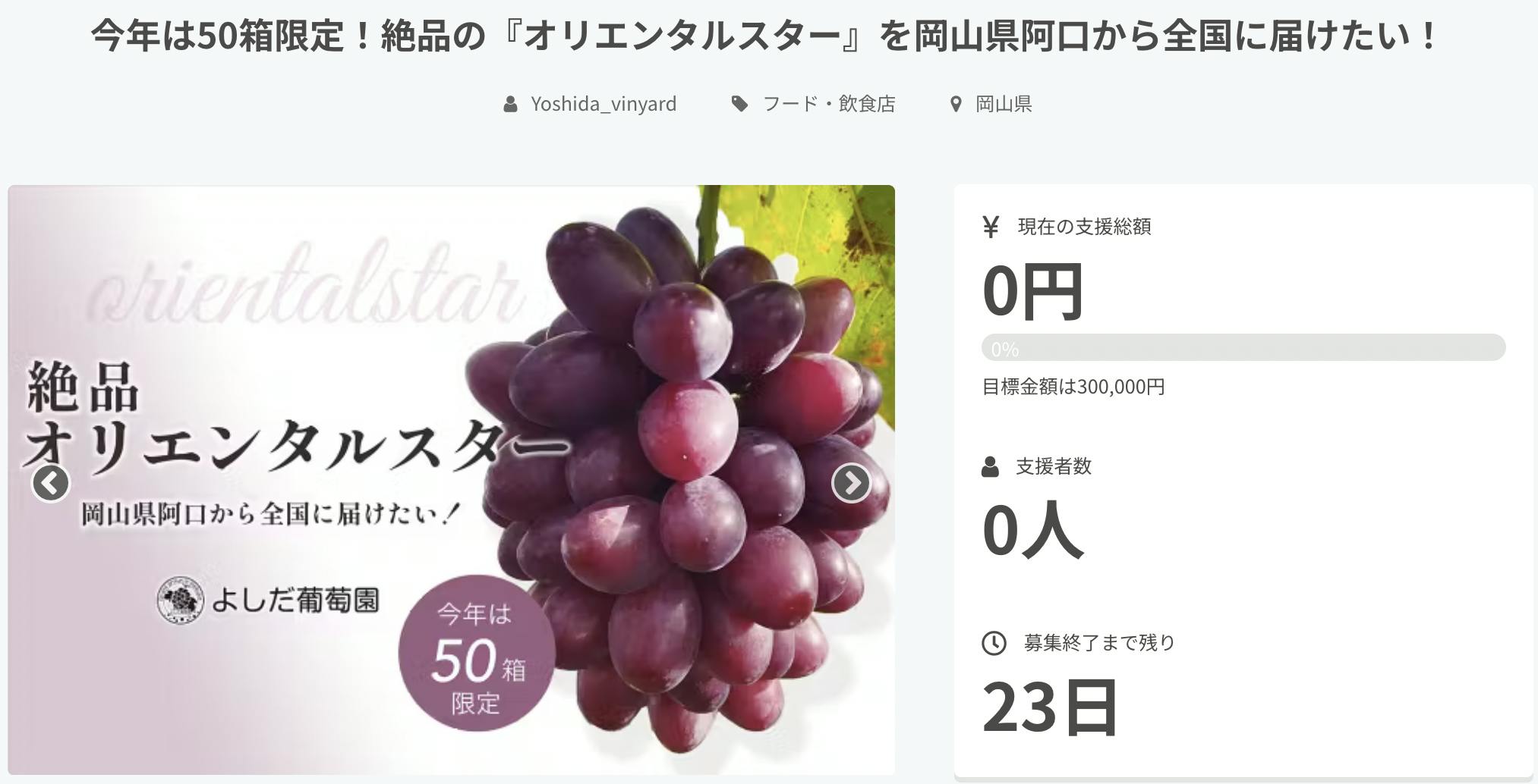 2024/06/03 06:16お世話になっております。よしだ葡萄園の吉田です!びっくりすることに、クラウドファンディング開始から3日目にして40個に対して支援が入り、残すところ10個となりました!昨日も、stc1様a62660baf554様oshioki1103様6000688002様sleepingcat21様shinkb様Wataame_cf様megu2102様kihide様guest24e104a136d4様spade20161様user_c25d1f6cfbb4様pia_hidechan様user_bf8af091b294様YoshiyukiM2様ari_yumi様Tomecin453様nyamiy2060様ご支援をありがとうございました!ラスト10個!今日売れたらいいなーなんて夢を見ています! もっと見る