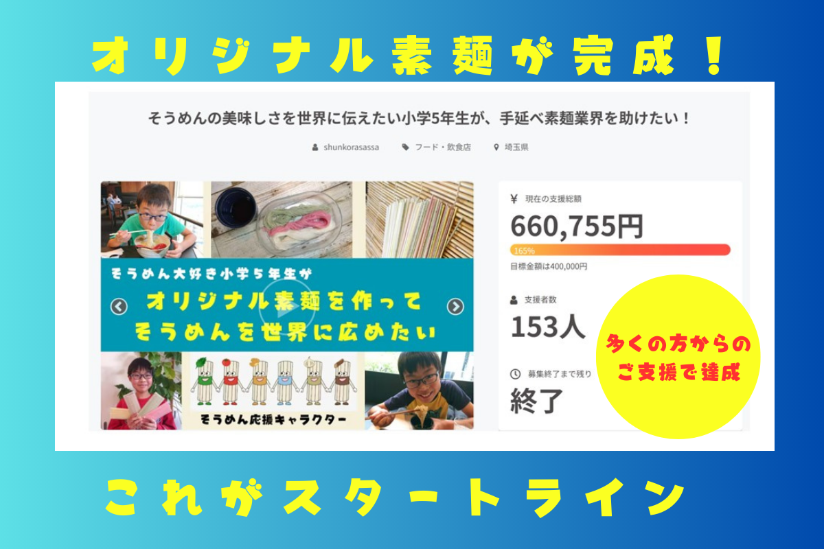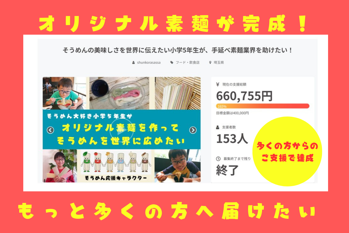 153人の方が応援してくれて、660,755円の支援金が集まり、1300食以上のオリジナルそうめんを作ることができました。