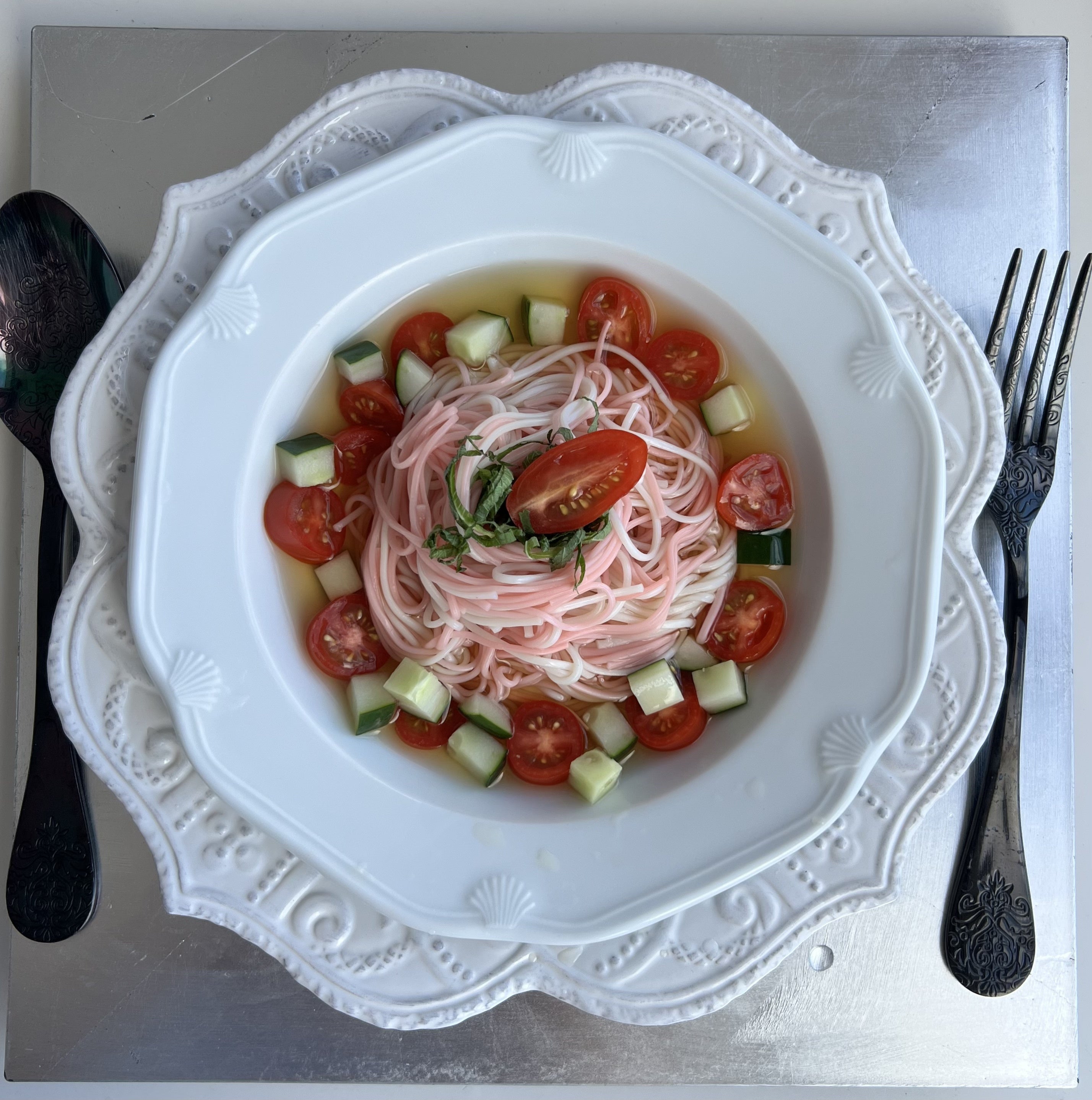 とくに、私は、ごぼうそうめんにごぼうの素揚げをトッピングしたものがクセになる美味しさで好きです。 アメリカ人の夫には、白素麺の淡白な感じよりもトマト素麺に、トマトときゅうりをトッピングして、爽やかなカッペリーニ風にしたら、麺にトマト味がついてるのと、ツルツルとした喉越しでおいしいと、たくさん食べていました。