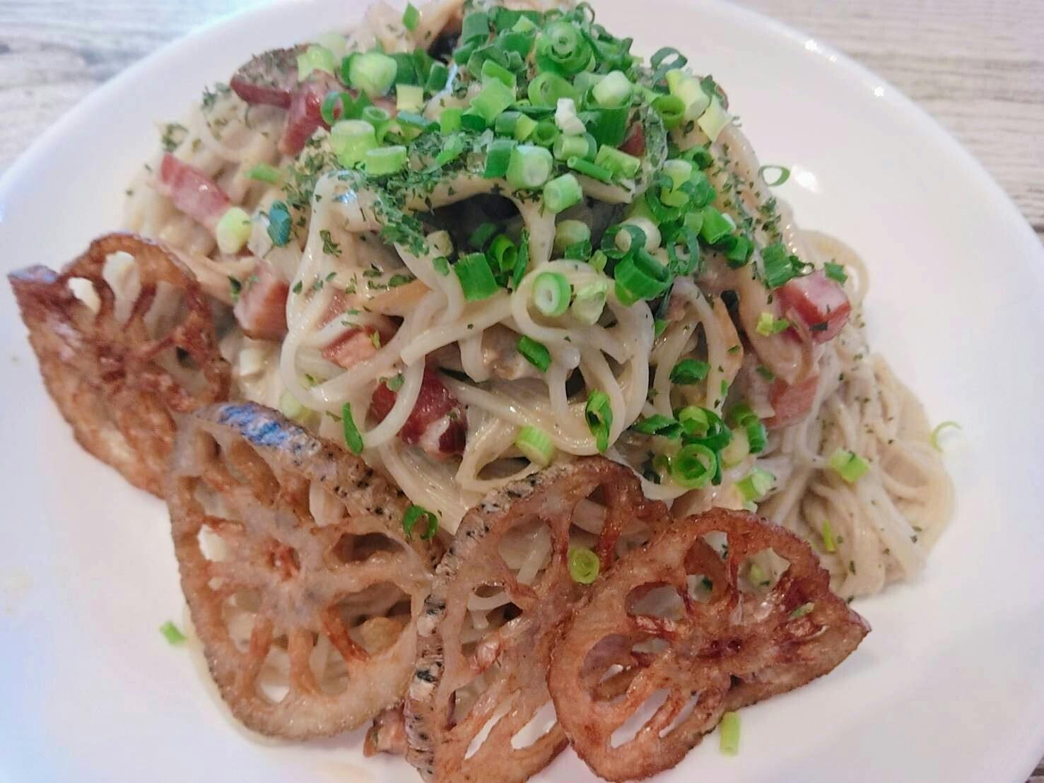 今日のお昼は俊麺のごぼう麺を使ってベーコンとエリンギのクリームそうめんを作りました。レンコンの素揚げがいい感じ。僕はエリンギを細く裂いたり、ベーコンやネギを切ったりしてがんばりました。パスタ風に使うときは1分30秒ゆでて冷水でしめてフライパンに合わせて下さい!水切りしても水分が多いので合わせるソースは少し濃いめで!