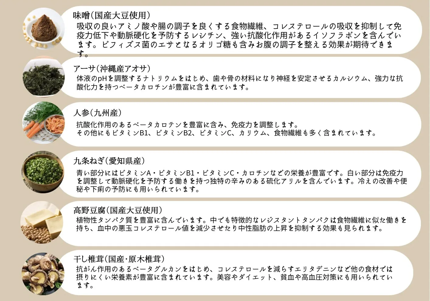 原材料:大豆(国産)、米(国産)、塩(国産)、アーサ(沖縄産)、人参(九州産)、九条ねぎ(愛知県産)、高野豆腐(国産大豆使用)、干し椎茸(国産、原木)